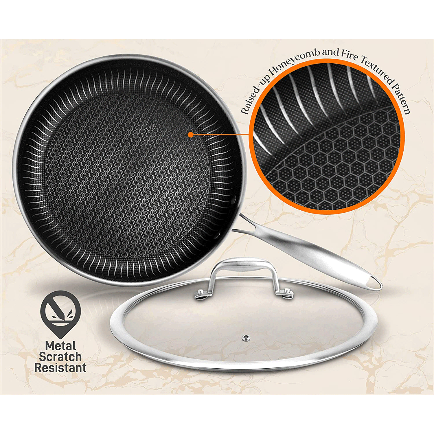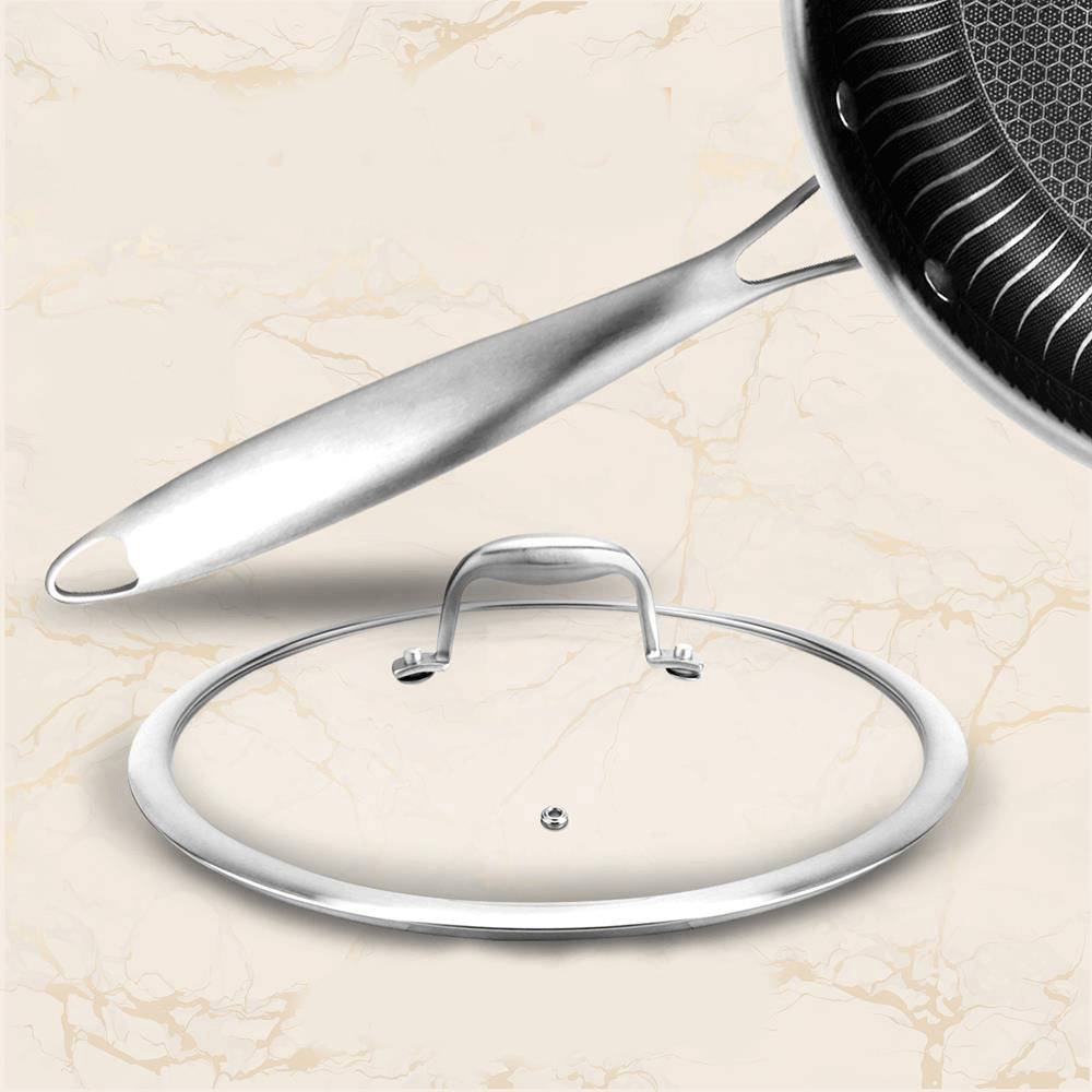 This stylish 7-piece kitchenware set features a modern, metallic cookware design to match any kitchen. The set includes an 8-inch small fry pan with lid, 10-inch medium fry pan with lid, 12-fry pan with lid, and 12-inch wok. The raised honeycomb pattern and fire textured pattern provides an exceptional and scratch-resistant surface. For fast and even heat transfer, a triply composite structure with an aluminum core is fused between 2 layers of stainless steel.