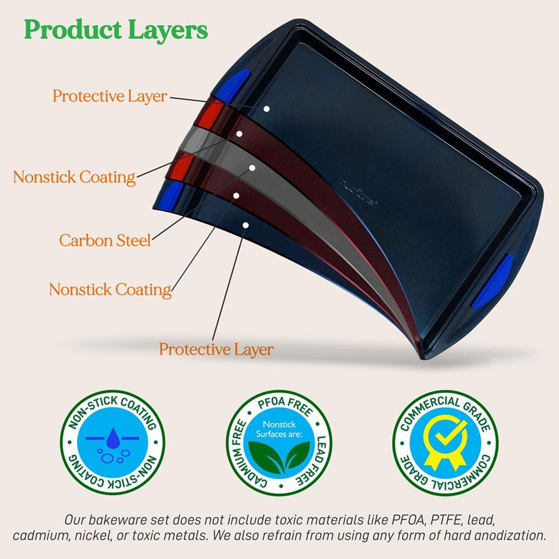 Get ready for your own great bake-off with the NutriChef 10 Piece Carbon Steel Bakeware Set 2 Pack. Each piece is constructed of carbon steel and covered in an eco-friendly non-stick coating. Heat-resistant silicone inserts on the handles make the journey from oven to table safe and easy.