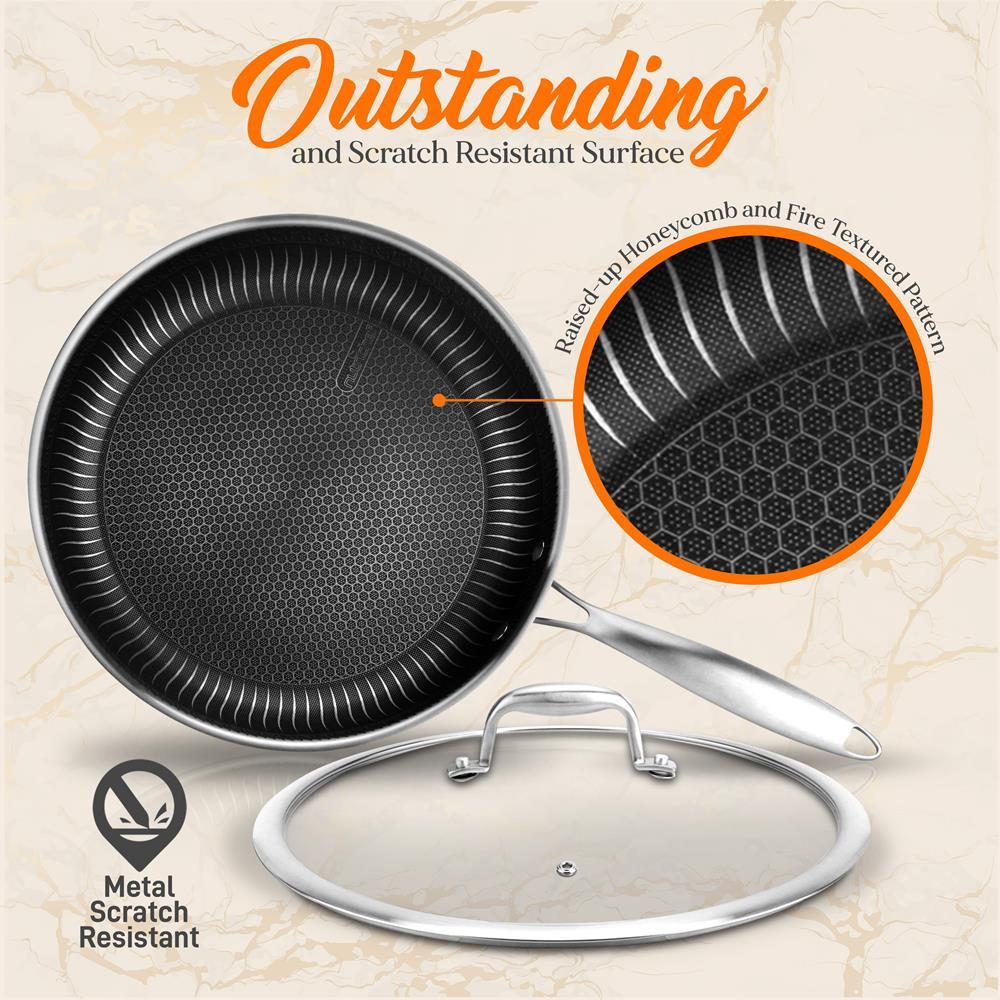 - Includes an 8-inch small stir fry pan with lid, 10-inch medium fry pan with lid, and 12-inch large fry pan with lid