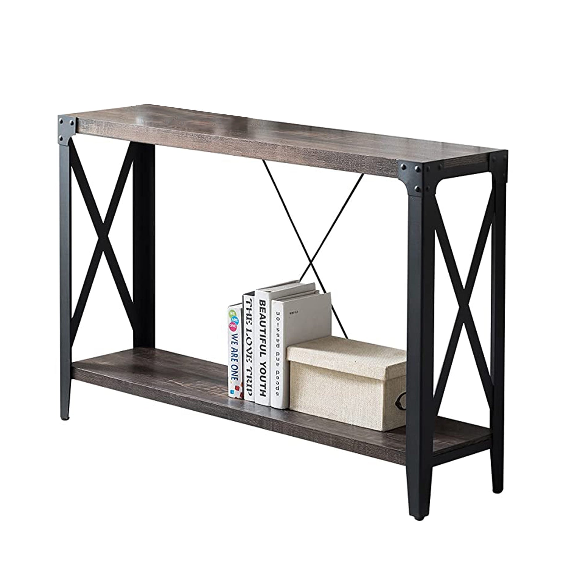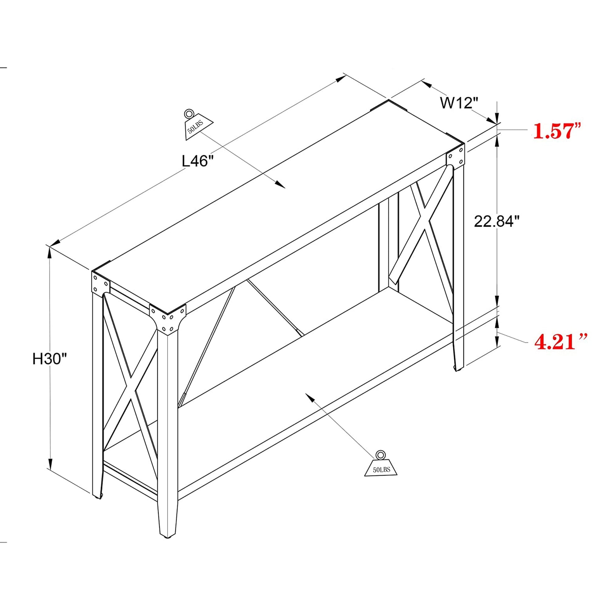 This stylish piece of furniture is slim enough to be the perfect fit for each of your spaces and allows you to show off your treasures and all your decorative pieces. This accent piece is especially functional behind the couch, or as an accent table in the entryway or hallway. The table is made to fit in any space while maximizing storage with 2-tier shelving perfect for displaying crafts, decorations, and other items. The durable and stable X-shaped metal frame legs and bar support provide stability and a weight capacity of up to 50 pounds, perfect for holding smaller TVs. Includes adjustable, scratch-resistant feet and all instructions and accessories needed for fast and easy assembly.