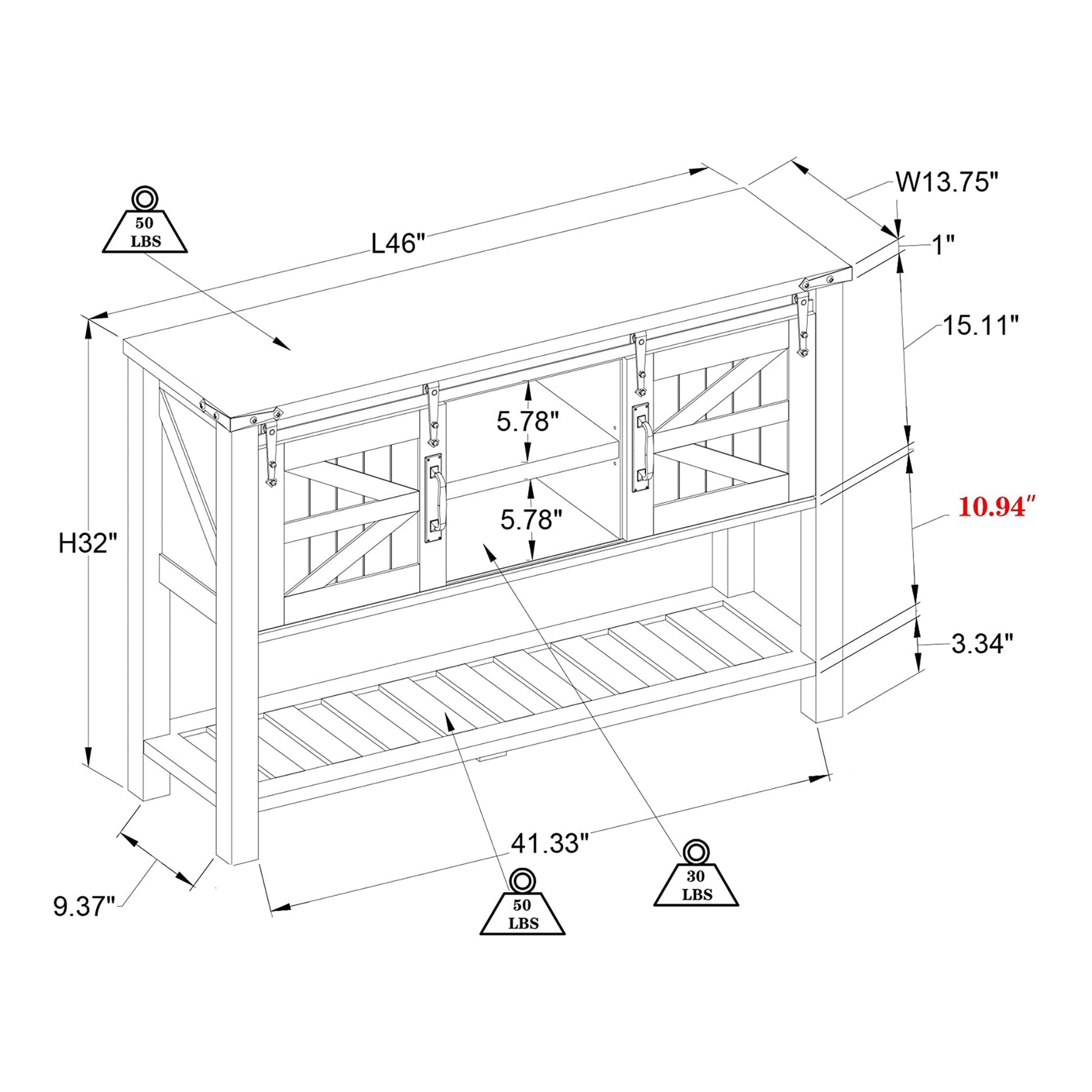 The sliding doors conceal 2 deep-set shelves where you can organize your linens, blankets, board games, DVDs, or everyday items and keep them easily out of sight when not in use. The lower shelf includes middle leg support that prevents it from sagging, even when storing heavier items. Measuring 46 inches long by 13.78 inches wide by 31.97 inches tall, this table offers ample storage and decorative space.