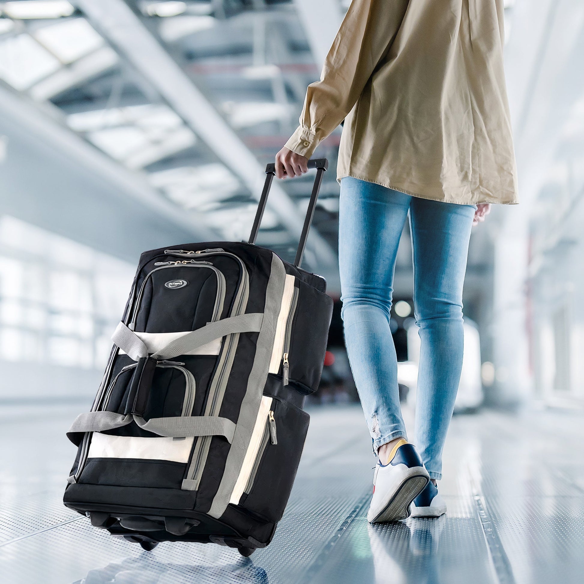 Crafted with precision and durability in mind, this lightweight luggage is constructed using 1200 D Protecflon polyester, ensuring that your belongings stay safe and secure throughout your travels. With 8 pockets, this rolling luggage bag offers maximum packing versatility and the ability to reach all your items as you travel. A U-shaped top opening provides access to the spacious main interior compartment, so you don't have to shuffle around smaller items to find what you need. Easily maneuver this duffel bag with wheels using the push-button retractable handle that can hide in a zipper pocket when not in use. Roll this luggage bag for traveling around airports or simply out to the car with recessed metal ball-bearing in-line skate wheels that will keep rolling after each trip.