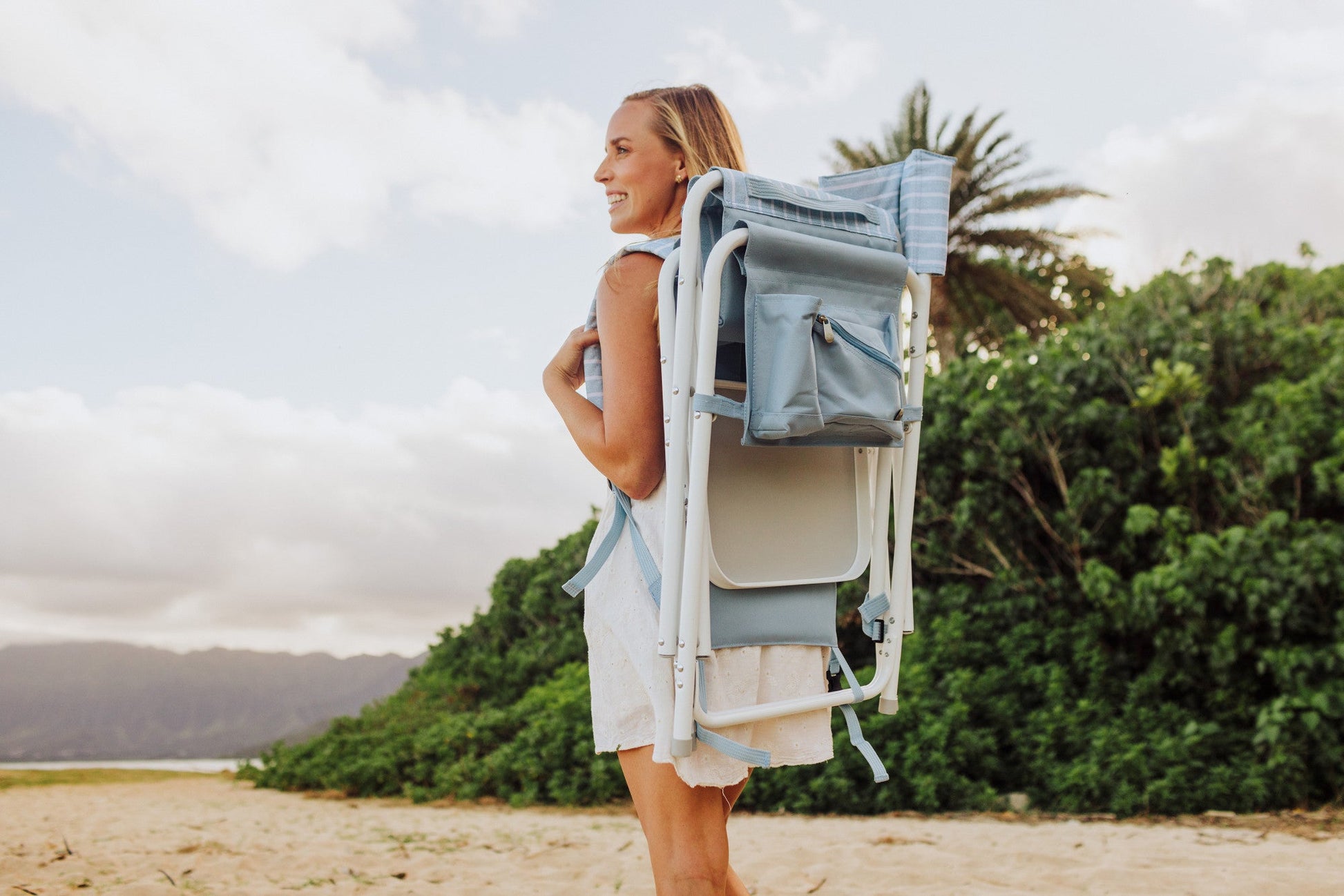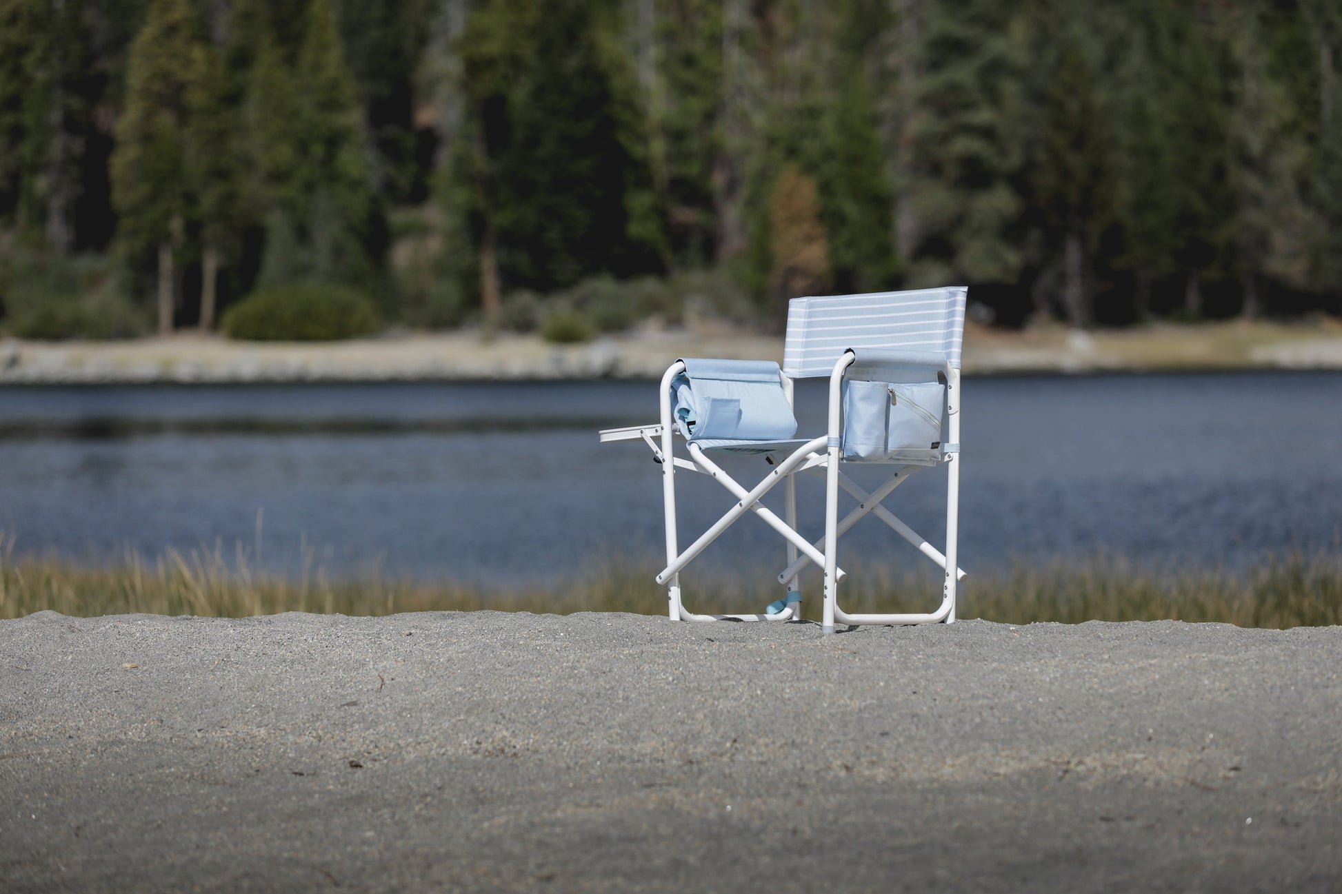 Quiet on the set! Cast the Outdoor Directors Chair with Side Table in your next outdoor adventure. This comfortable, portable camping chair is made with durable polyester but features a lightweight, easy-carry aluminum frame that folds down flat and reveals integrated backpack straps for total portability. Even so, it's still strong and durable enough to hold up to 300 lbs of Hollywood legend. Whether your location is the beach, the lawn, the campground, the picnic table, or your own private island, this camp chair is majorly comfortable, stylish, and Academy worthy. The fold-out side table is perfect for keeping food, drinks, and screenplays close-at-hand. The insulated beverage pocket and armrest caddy for essentials completes this beach chair. For the sequel, add some shade to your camping chair by inserting a beach umbrella (sold separately) into the attached umbrella loop. This outdoor directors chair with side table is always ready for, "Action!" You’ll never need to retreat to your trailer with a picnic chair this talented.