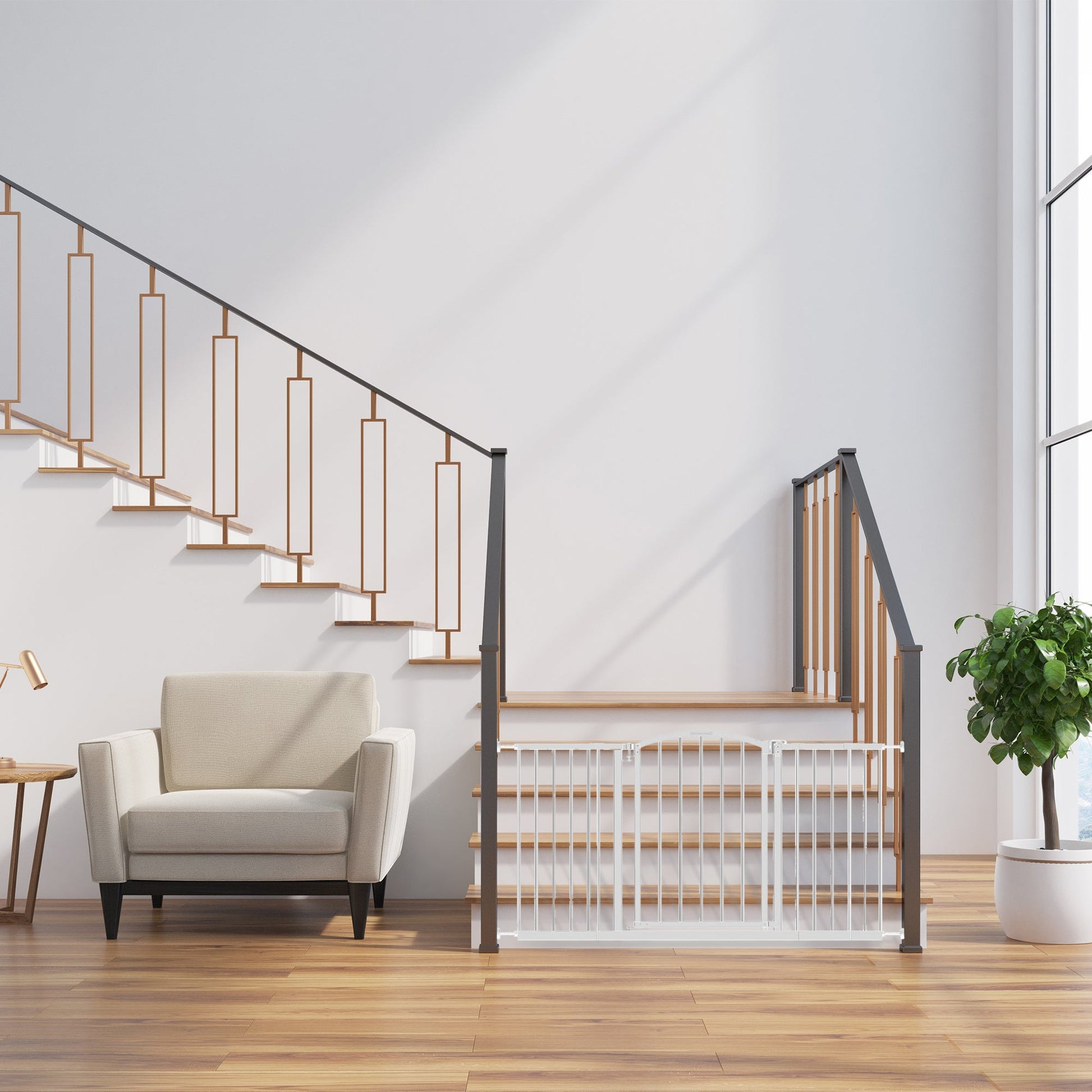 Featuring a convenient 19.5-inch wide door, passing through the gate is easy with just one hand, providing seamless access while maintaining safety. Rest assured, your pet will be securely contained thanks to the latch system, while the door stopper stops the door from swinging outward when installed over stairs. Designed with a sleek white finish, this metal dog gate seamlessly blends with any décor, ensuring versatile door and stair gate complements your style while keeping your furry friend safely contained.