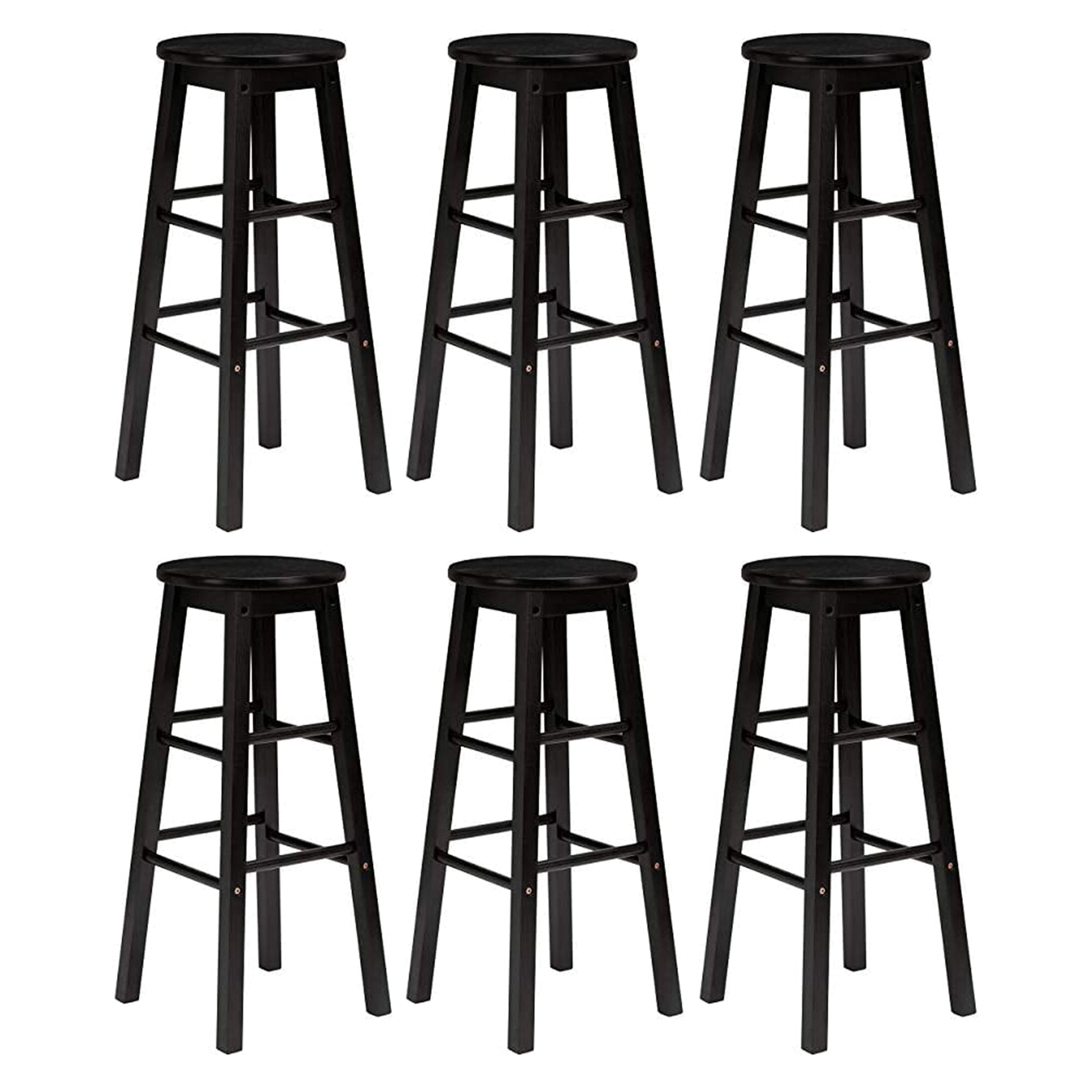 These stools are ideal for all occasions, whether paired with a small dining space that you already have, adding seating to your countertop, or casual entertaining space. Constructed from sturdy, durable wood, this set of 6 bar stools feature comfortable, round, backless seats that stand 24 inches high, with a classic and modern design that fits in with any existing decor. With 4 well-balanced, square legs, along with 8 built-in bars for your feet, each stool can withstand up to 225 pounds. Good for eating, working, entertaining a few guests, or just sitting around, these stools are a great addition to that new bar, counter height table, or working area. Light assembly is required before you can use these bar stools, with all required hardware included.