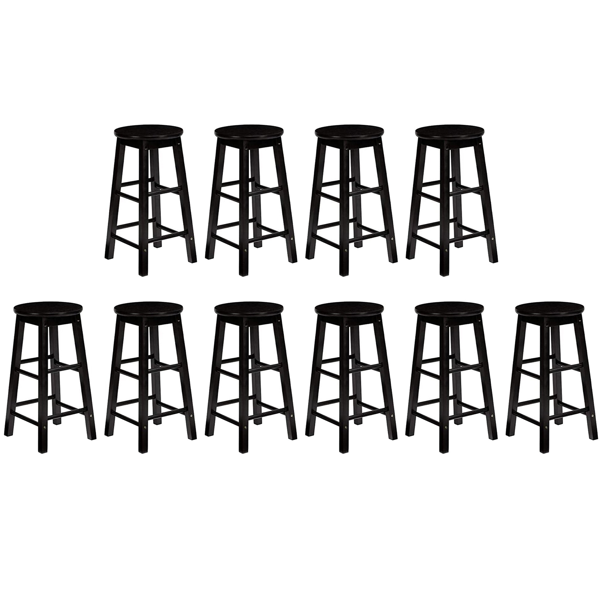 These stools are ideal for all occasions, whether paired with a small dining space that you already have, adding seating to your countertop, or casual entertaining space. Constructed from sturdy, durable wood, this set of 10 bar stools features comfortable, round, backless seats that stand 29 inches high, with a classic and modern design that fits in with any existing decor. With 4 well-balanced, square legs, along with 8 built-in bars for your feet, each stool can withstand up to 225 pounds. Good for eating, working, entertaining a few guests, or just sitting around, these stools are a great addition to that new bar, counter height table, or working area. Light assembly is required before you can use these bar stools, with all required hardware included.