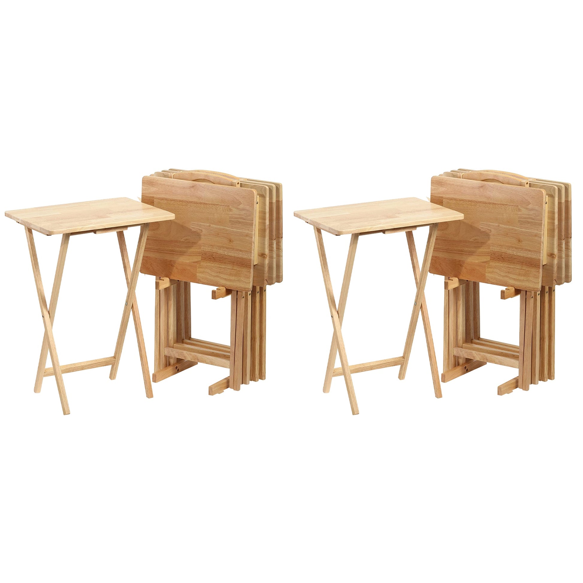 These tray tables expand and collapse with ease. Rectangular in shape and made from solid wood, these tables feature a flat and spacious conventional tabletop that makes them great for versatile use. The solid wood construction ensures that these tables stand up against time. The trays store easily behind a door, in a closet, or even behind the sofa, thanks to the handy storage rack. Collapse each table when finished, and set it into the storage rack in an upright, filed position for easy and compact storage.