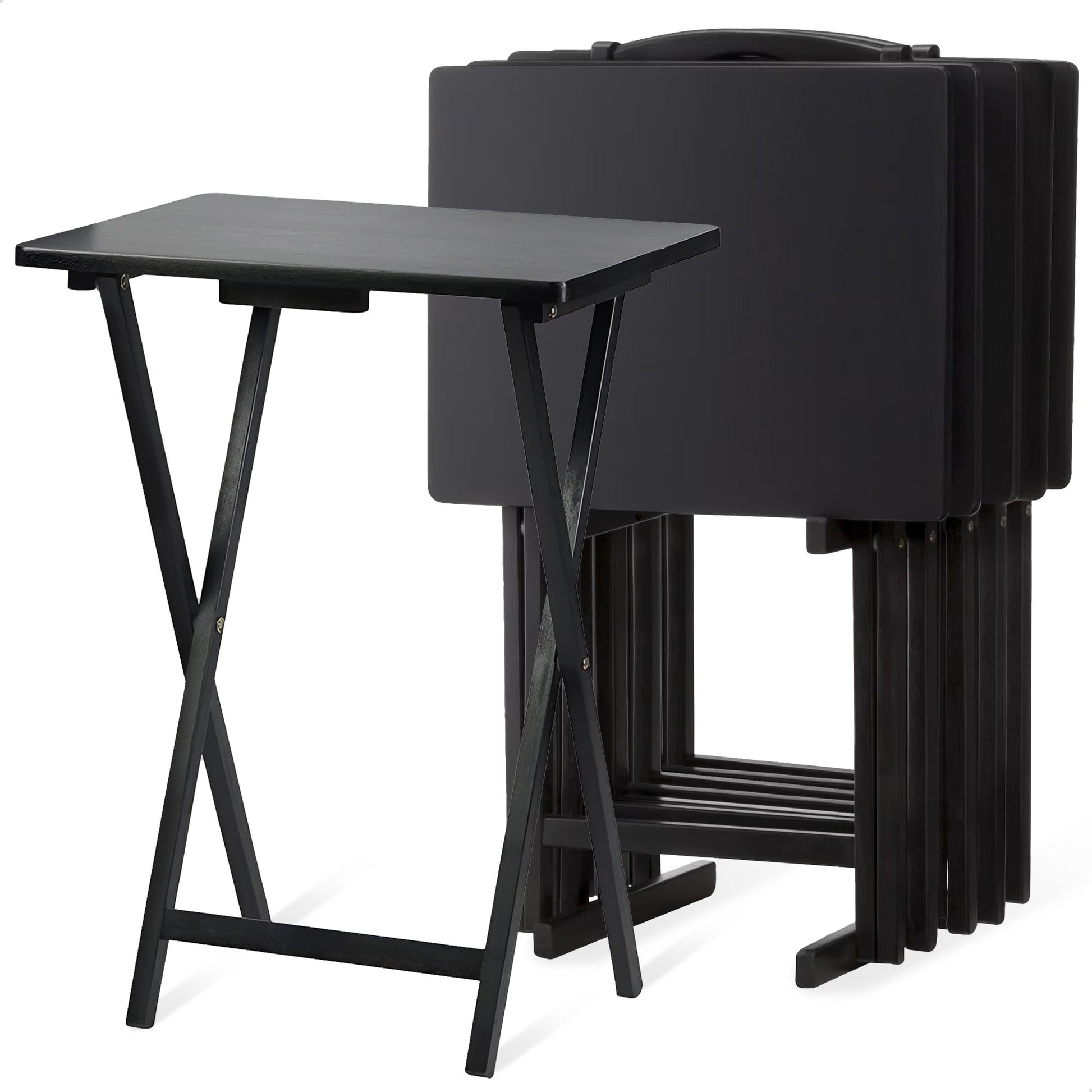 PJ Wood Folding TV Tray Tables with Compact Storage Rack, Black, 5 Piece Set