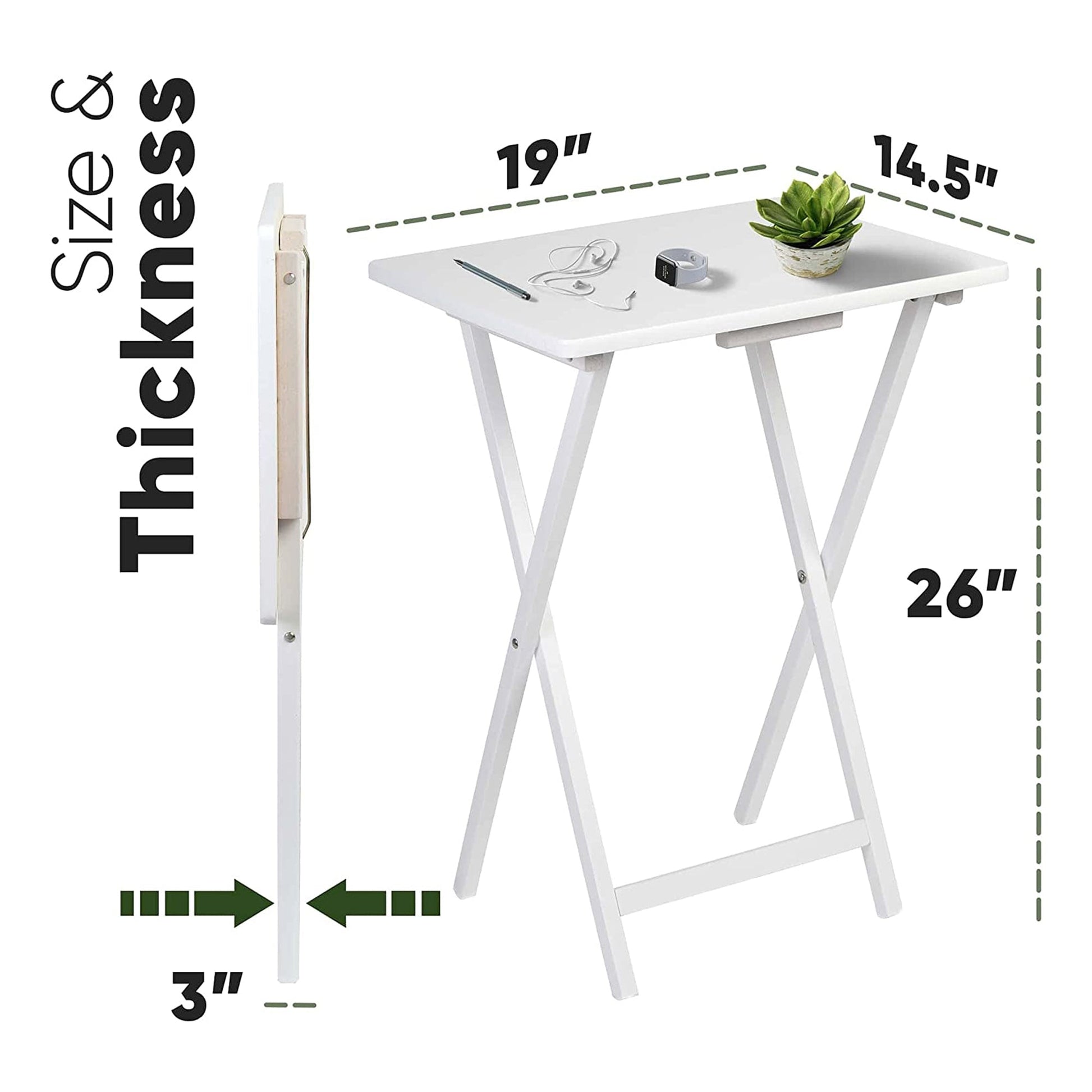 - Each sofa snack table measures 14.57 inches wide, 19.09 inches long, and 26 inches tall and contains a spacious, flat surface