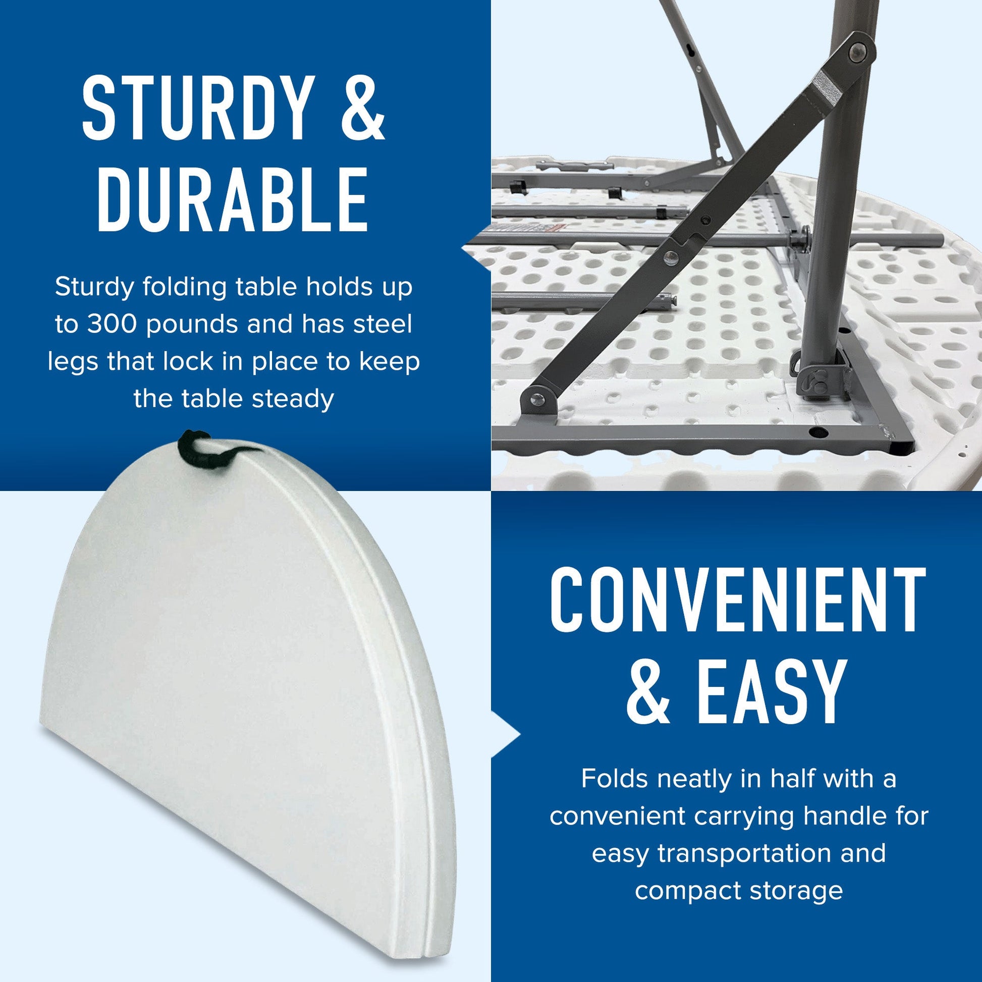 This heavy-duty folding table provides robust support with its sturdy steel legs, capable of bearing up to 300 pounds, ensuring safety and stability during use. Additionally, a secure locking system keeps the table securely open or closed as needed, adding to its convenience and reliability. Maintenance is a breeze; simply wipe it clean with a damp cloth. Assembly is quick and tool-free, and its stylish round design not only looks elegant but also minimizes the risk of accidents.