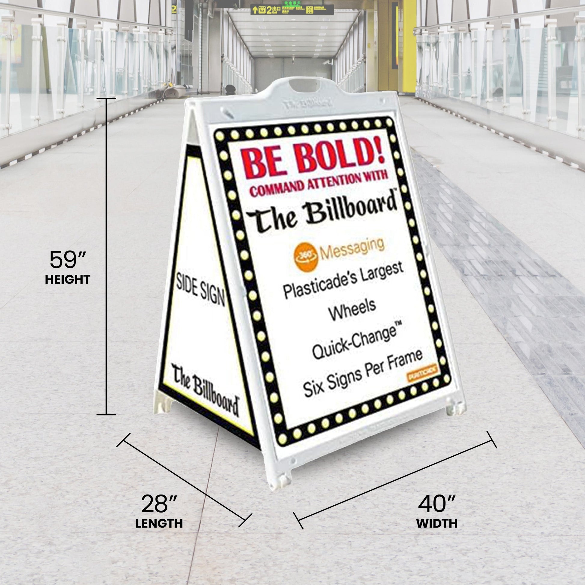 This poster frame also accommodates corrugated plastic signs or any rigid sign material you prefer. Stability is guaranteed with the integrated Stabilizing Bar, which keeps side signs firmly in place, even in adverse weather conditions. Stay Tabs further ensure that your main signs remain securely affixed, providing peace of mind. In addition, transportation is a breeze, thanks to the molded-in handle and 2 preinstalled wheels. Simply tilt back and roll the outdoor sign to your preferred location effortlessly.