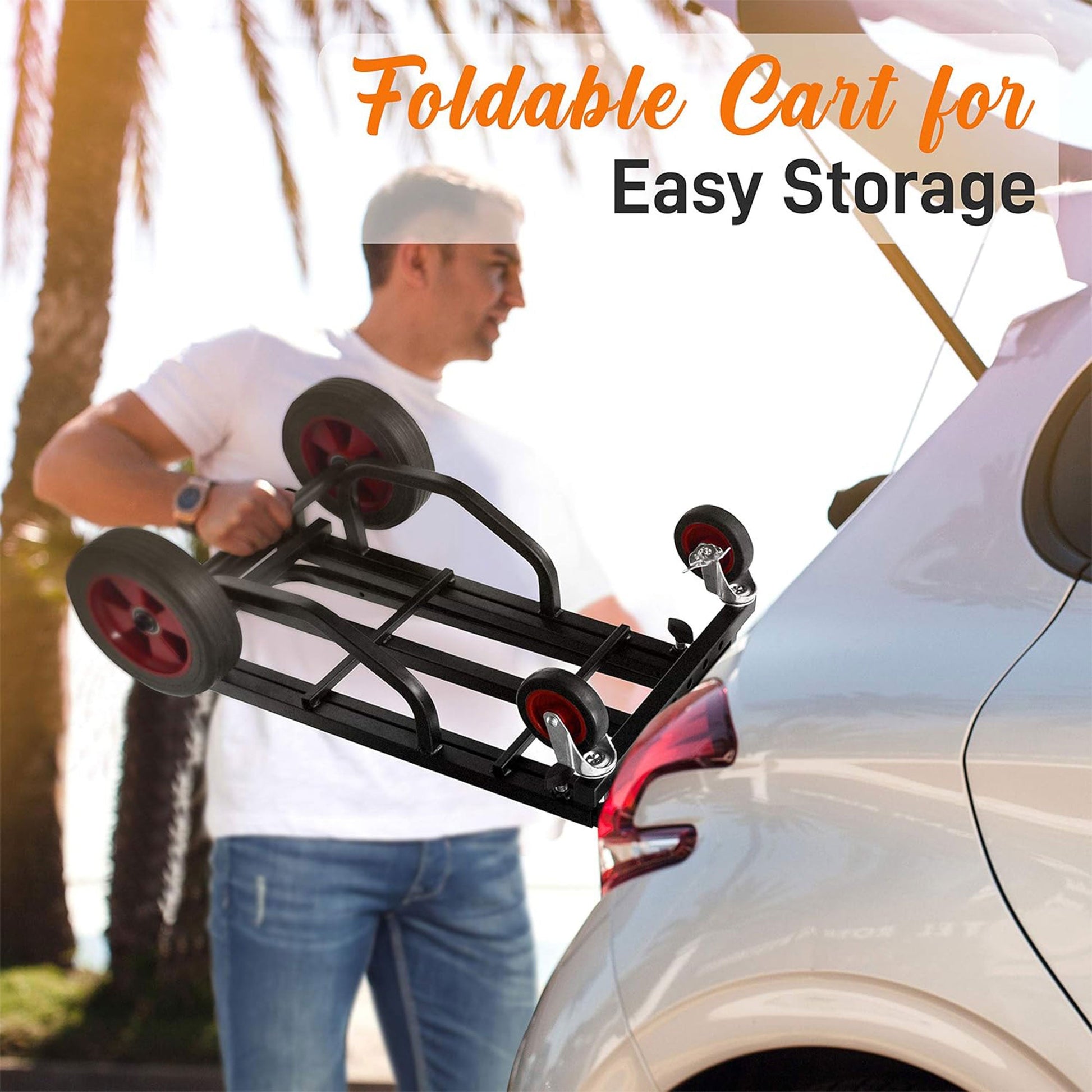 This innovative cart boasts an 8-in-1 design, replacing the need for multiple carts with its transformative capabilities. From a hand truck to a dolly, platform cart, or utility cart, this equipment cart adapts to various load sizes with ease. Equipped with R-Trac wheels and brakes, this moving cart offers unrivaled durability and stability, allowing for smooth precision movement in any direction. Conquer any terrain, from gravel to grass to uneven surfaces, knowing that slippage is minimized and control is maximized. With its compact foldable design, extending up to 44.25 inches for transporting substantial equipment, this dolly conveniently folds up for compact storage and maximizes efficiency without sacrificing space.