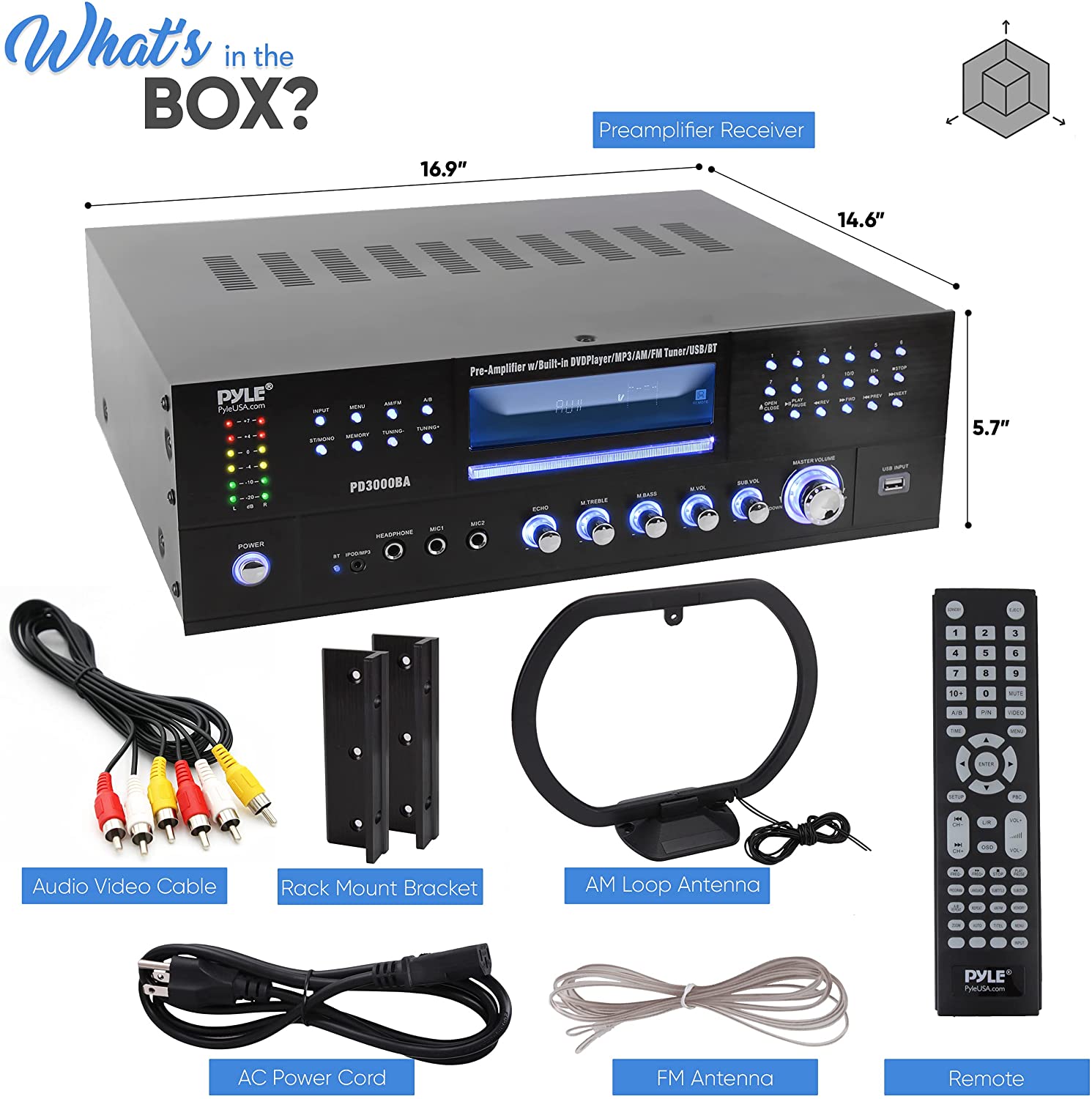 The Pyle Home Theater Receiver provides versatile audio and video entertainment for everyone. This high-Powered stereo preamplifier performance comes loaded with audio playback features including front-loading CD/DVD player, AM/FM radio, USB and SD flash memory readers, aux (3.5mm) input, and 2 1/4-inch microphone inputs. Bring the movie theater to you and easily connect external surround sound speakers to create a cinema-style media experience in your living room (not included).
