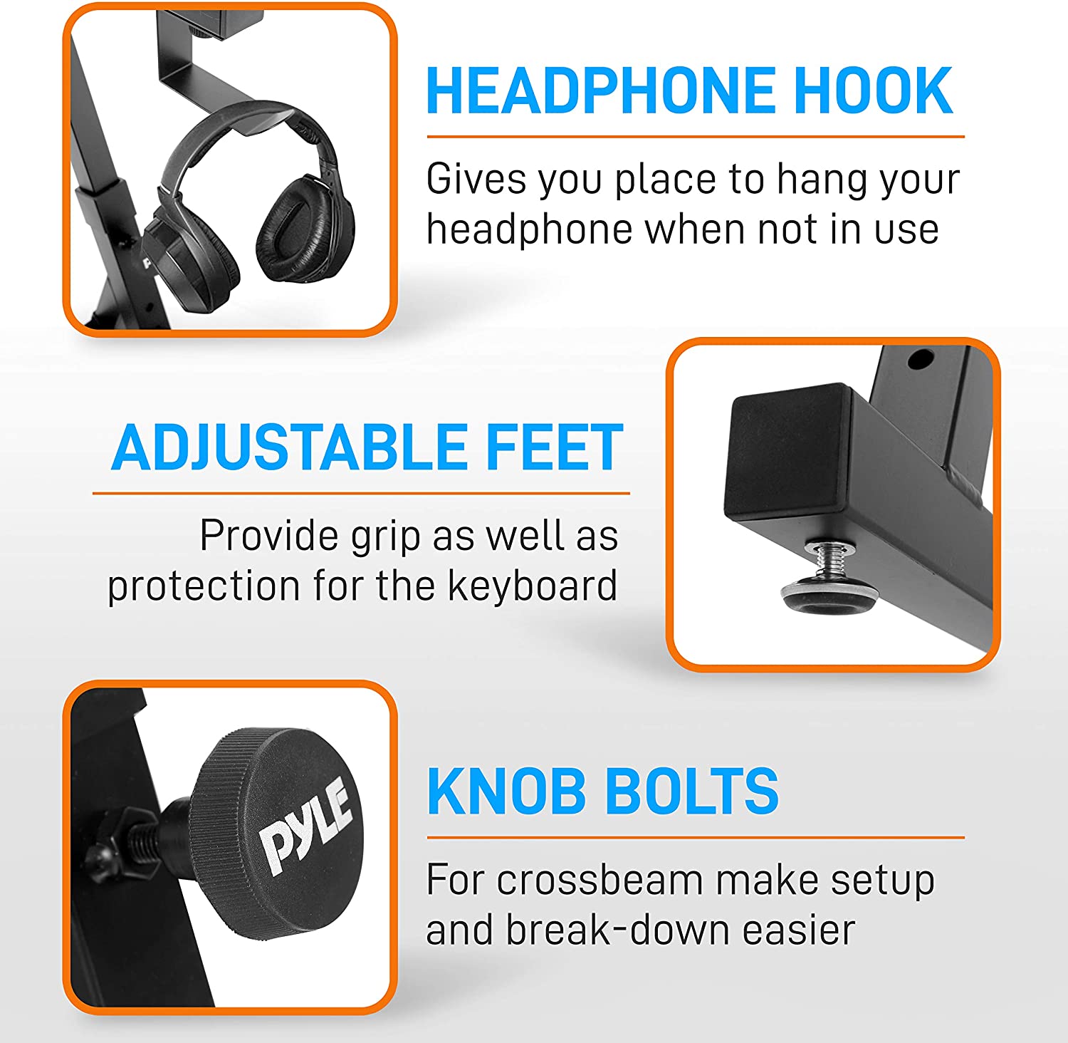 - Includes detachable headphone storage hook, protective feet, and easy to use knob bolts