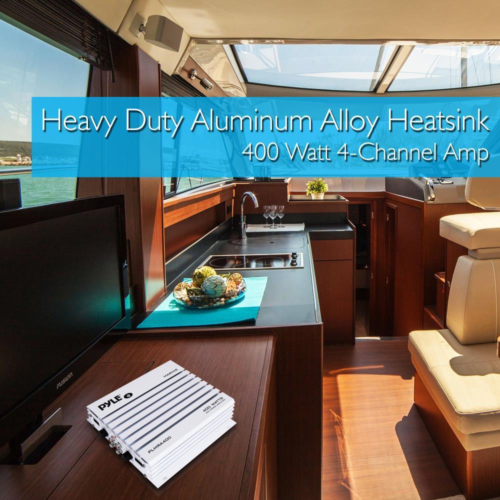 The Pyle Elite Series 400-Watt 4-Channel Marine Amplifier provides waterproof power for all of your boat speaker needs.