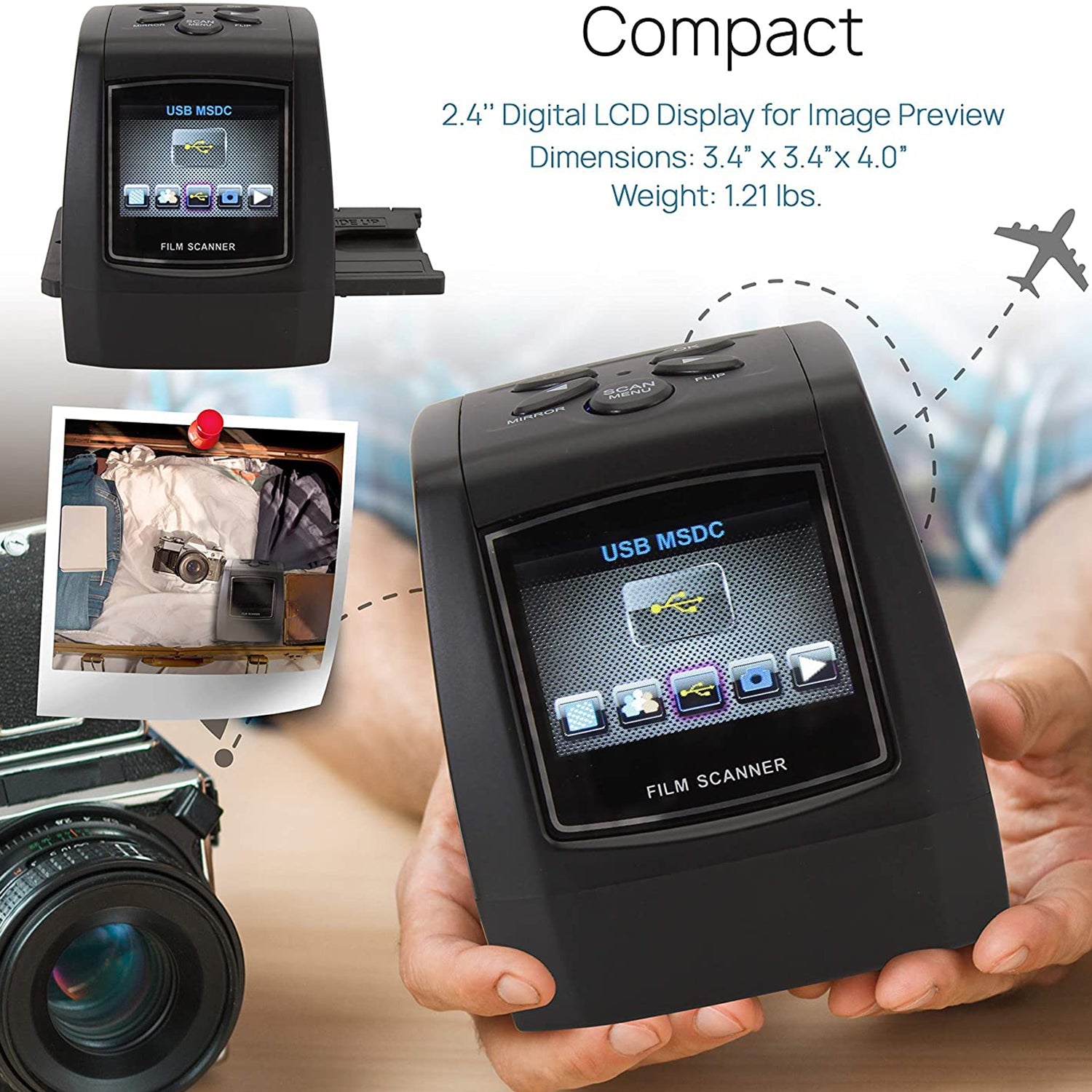 The built-in 2.4-inch digital LCD display allows for image preview and the scanner also features automatic exposure and color balance adjustment for great results. You can also use the TV output to connect for a bigger screen to your preview images. This digitizer image convert is Compatible with negatives, slides, and film. Keep your old memories alive with this easy-to-use film scanner.
