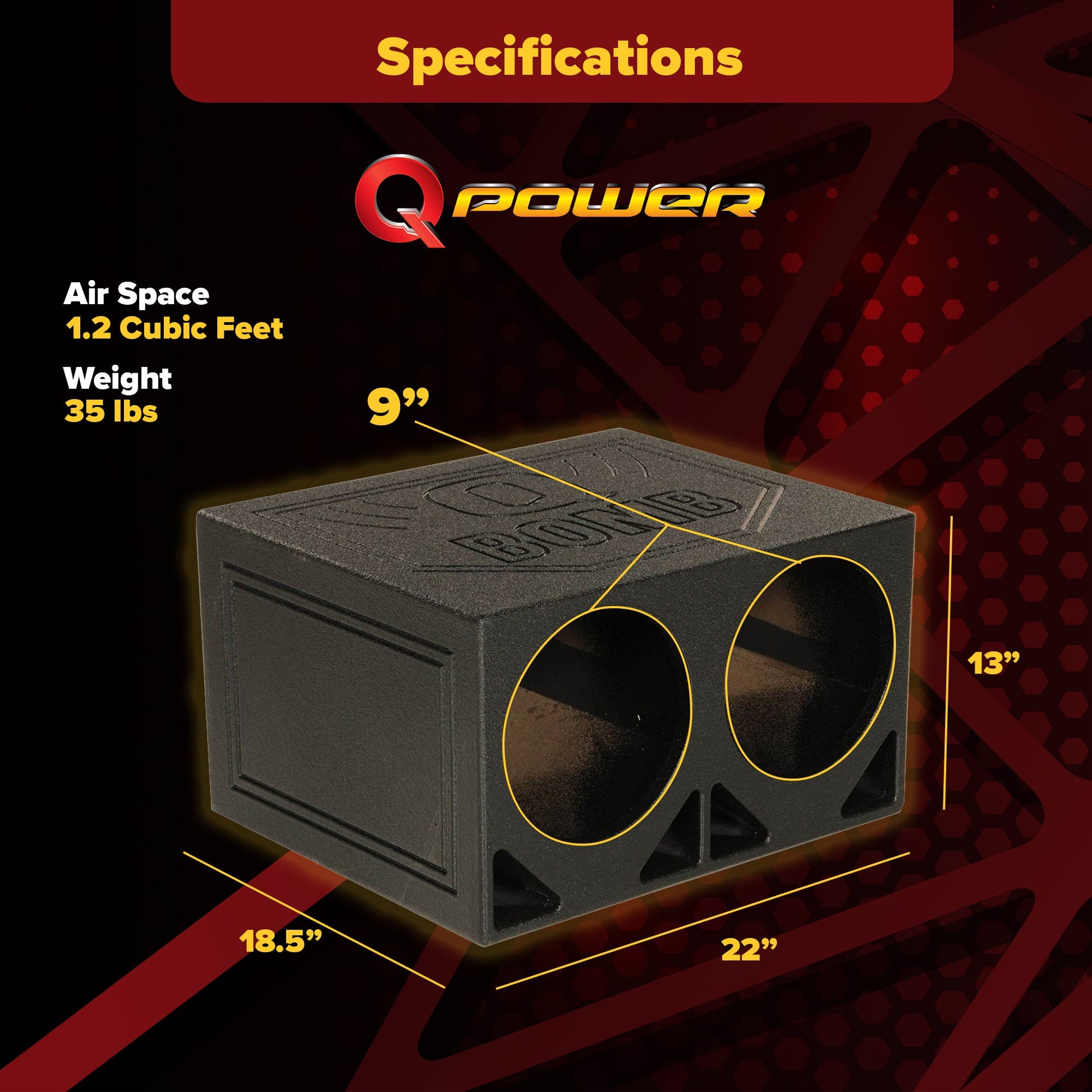 This vented sub box is constructed of 0.75 inch MDF wood and finished with a black bedliner spray for increased durability and added style. It features a dual vented chamber design and boasts 1.2 cubic feet of air space per subwoofer.