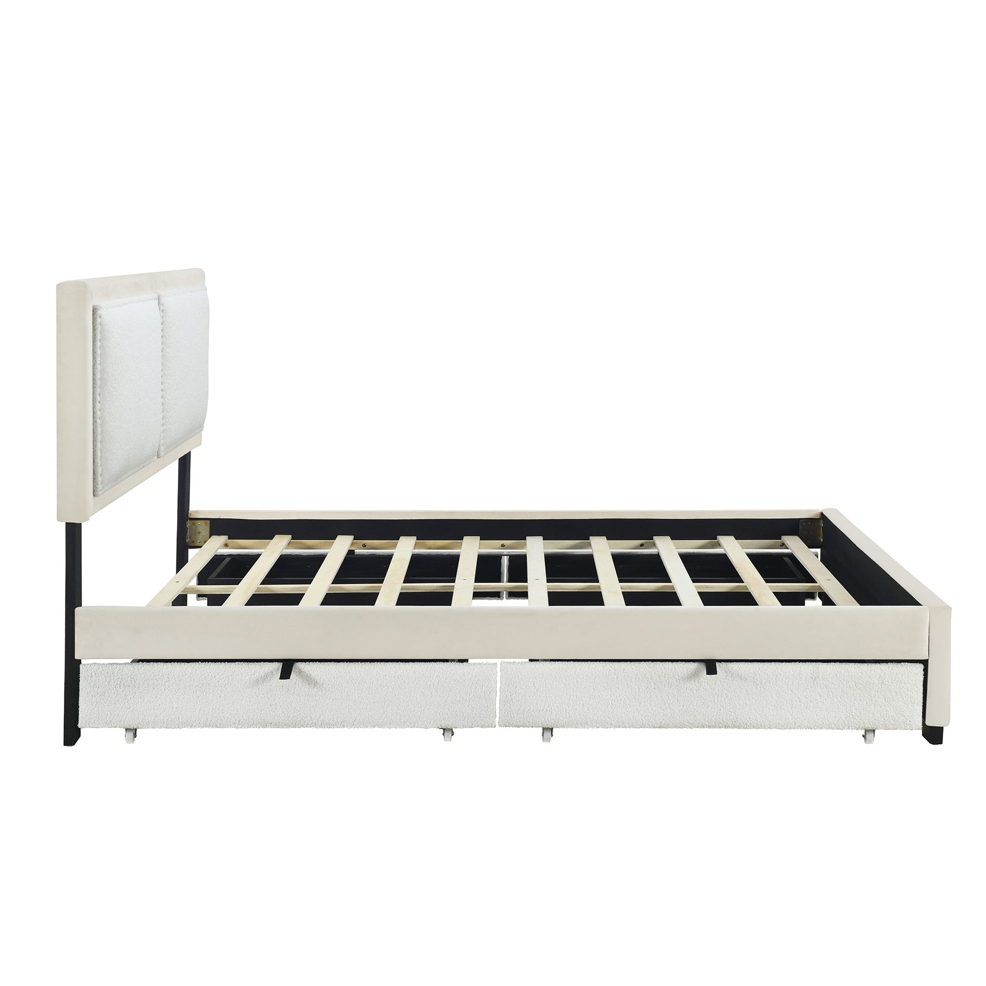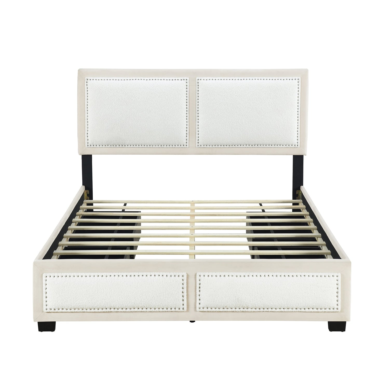 Queen Size Upholstered Platform Bed with Large Rivet-decorated Backrests and 4 Drawers, Velvet matched with Teddy Fleece, Beige+White