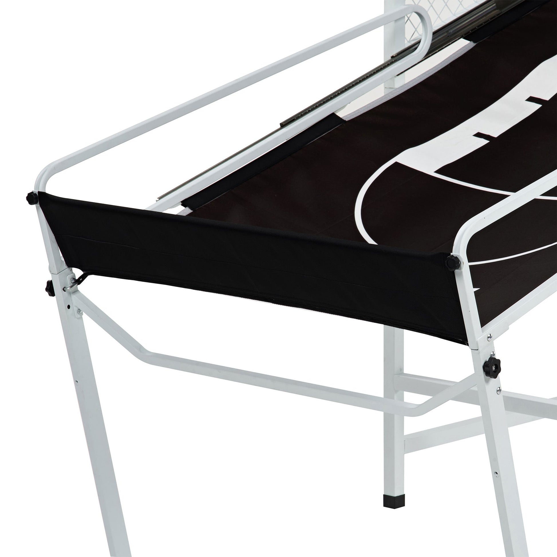 This steel cage game is built to last. It has a strong 1.4-inch square steel frame, a net system made of 1.57-inch square patterned steel for solid support, and a half-inch thick MDF backboard that's super stable. You can count on it to hold up the 2 steel rims and the advanced scoreboard for your basketball fun.