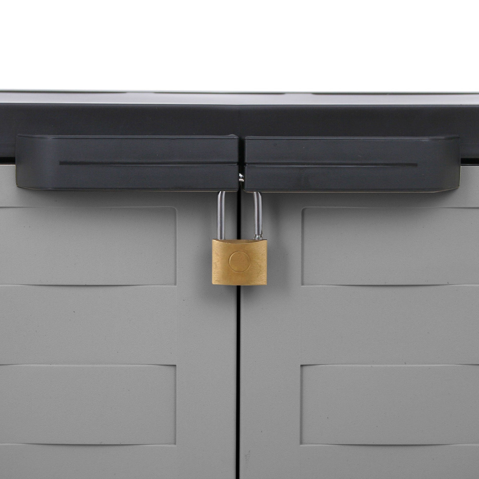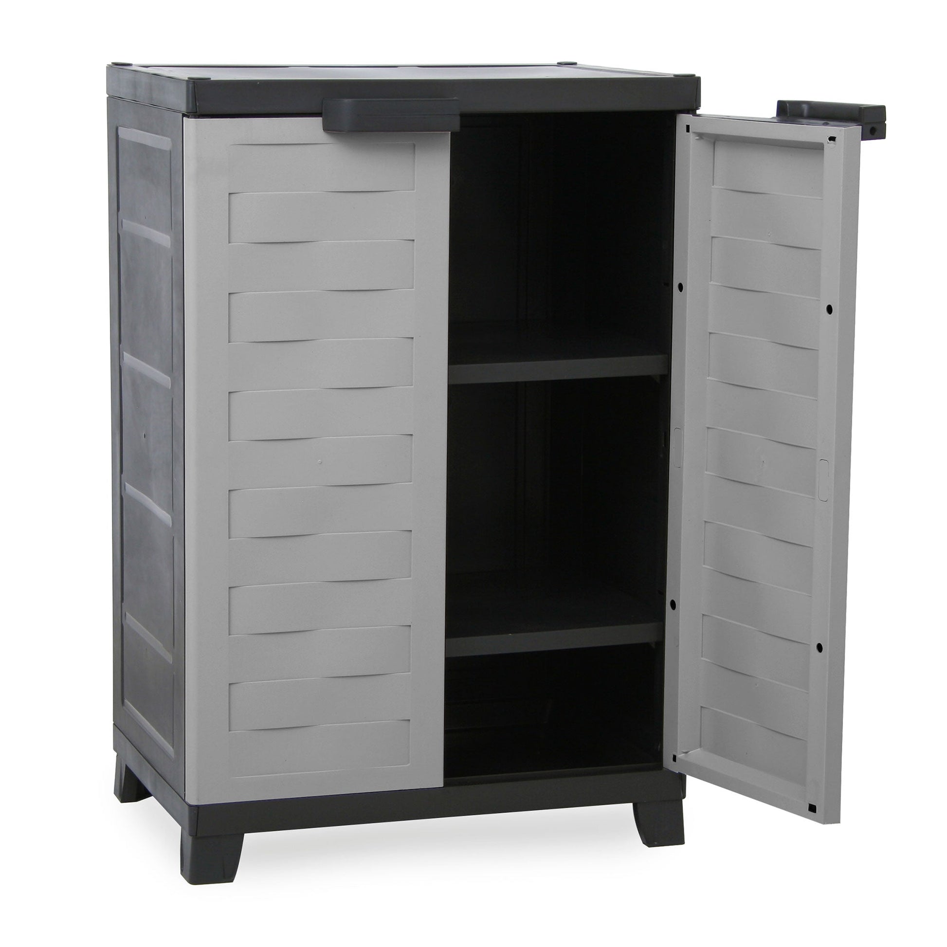 The 2-shelf organizing container provides ample space for items of many sizes. The shelf height can adjust to fit your custom needs and each shelf can support up to 44 pounds. While allowing easy access, this storage unit's doors are lockable in order to keep all of your items secure (lock not included). The organizer cabinet is made from recycled plastic and is heavy-duty for both indoor and outdoor use providing optimal versatility. Additionally, the colors complement any area well with its design. Easily assemble the 2-door cabinet as no tools are required and the included legs allow for easy cleaning.