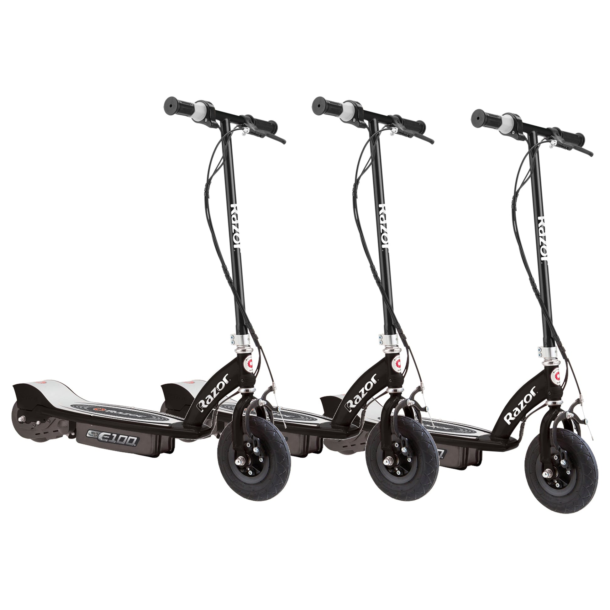 - With its kid-sized deck and frame, the Razor E100 electric scooter (3 pack) is the perfect introduction to electric-powered fun for riders ages 8 and up