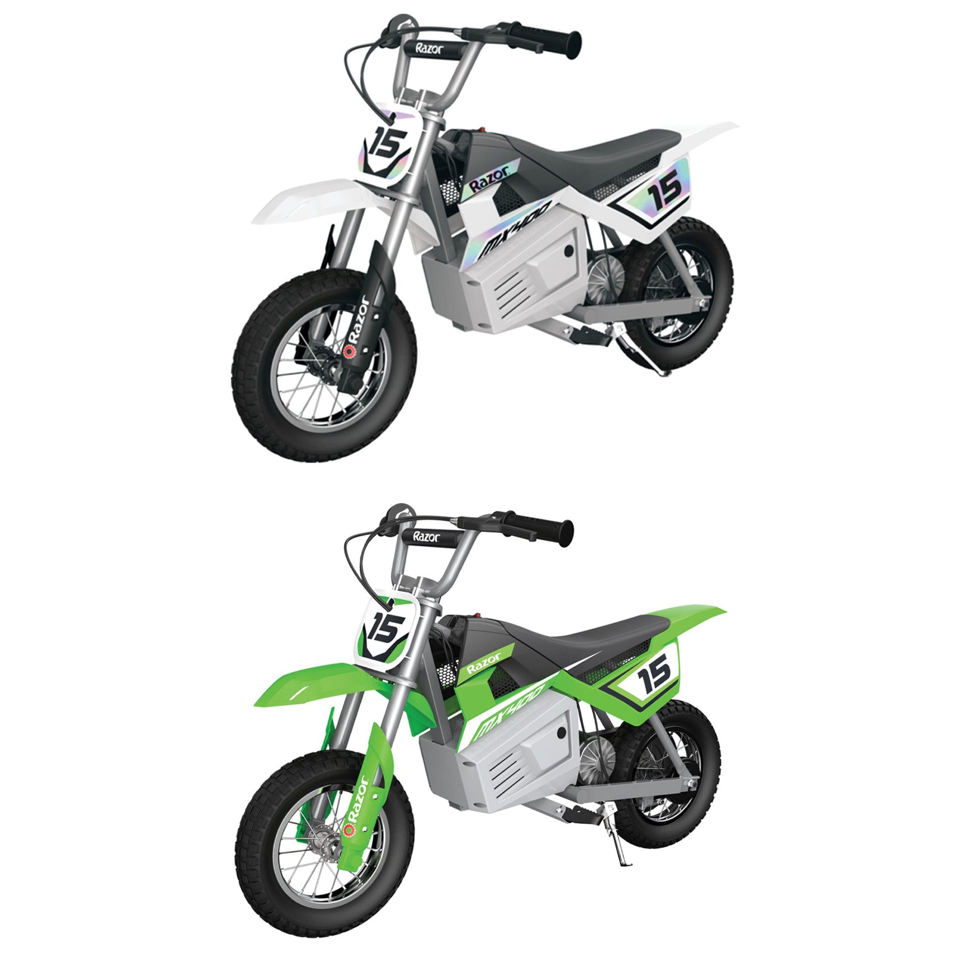 - 2 pack of Razor MX400 Dirt Rocket Electric Motorcycles in White and Green for ages 13 and up; Scaled-down dirt bike designed for younger riders