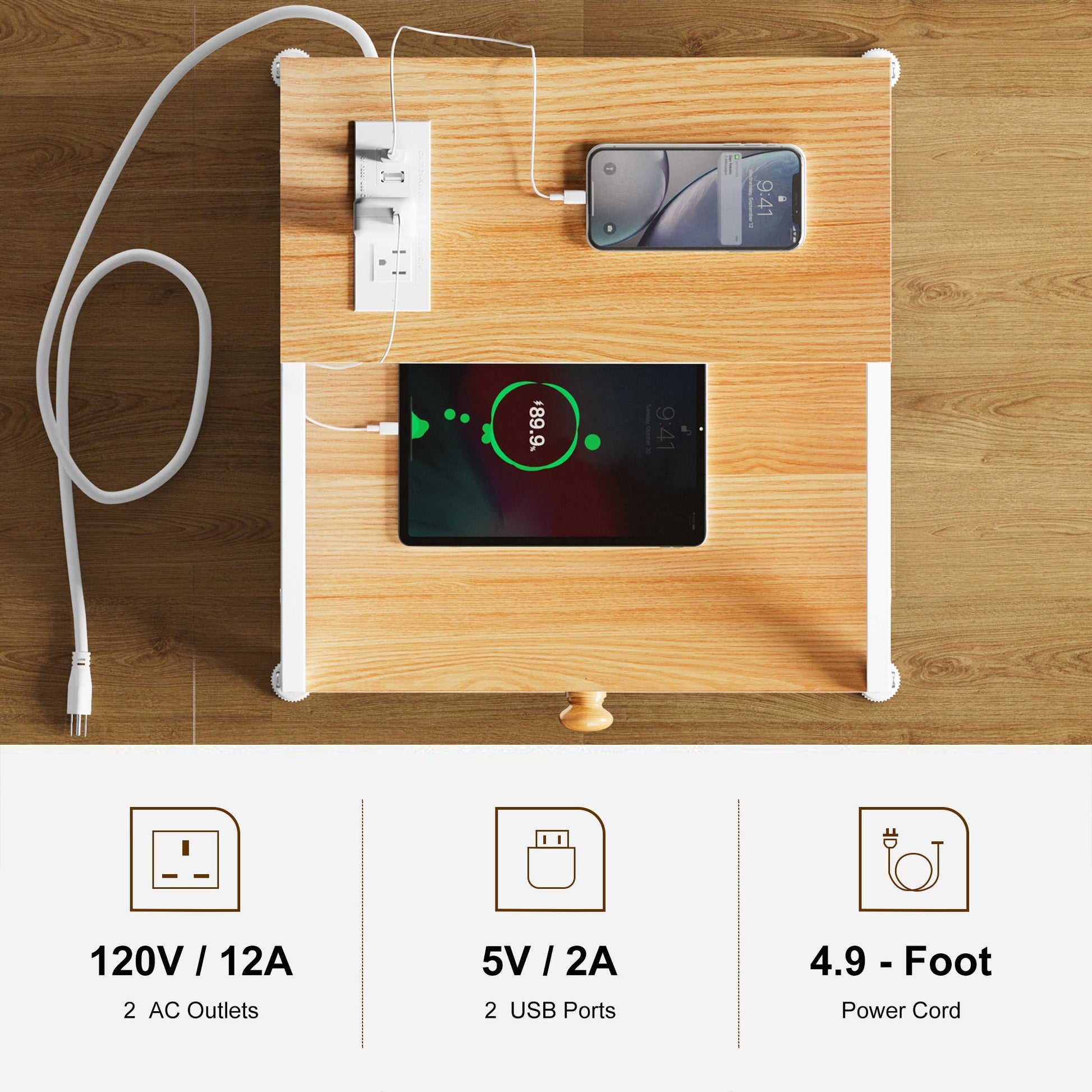 Crafted with a lightweight wooden top and a sturdy iron frame, this nightstand showcases a contemporary rustic charm that seamlessly blends with any interior style. It's more than just a piece of furniture, it's an essential addition to your home. Keep your electronic devices powered up with the built-in charging station featuring 2 sockets and 2 USB ports. No more fumbling for chargers or outlets, it's all at your fingertips.