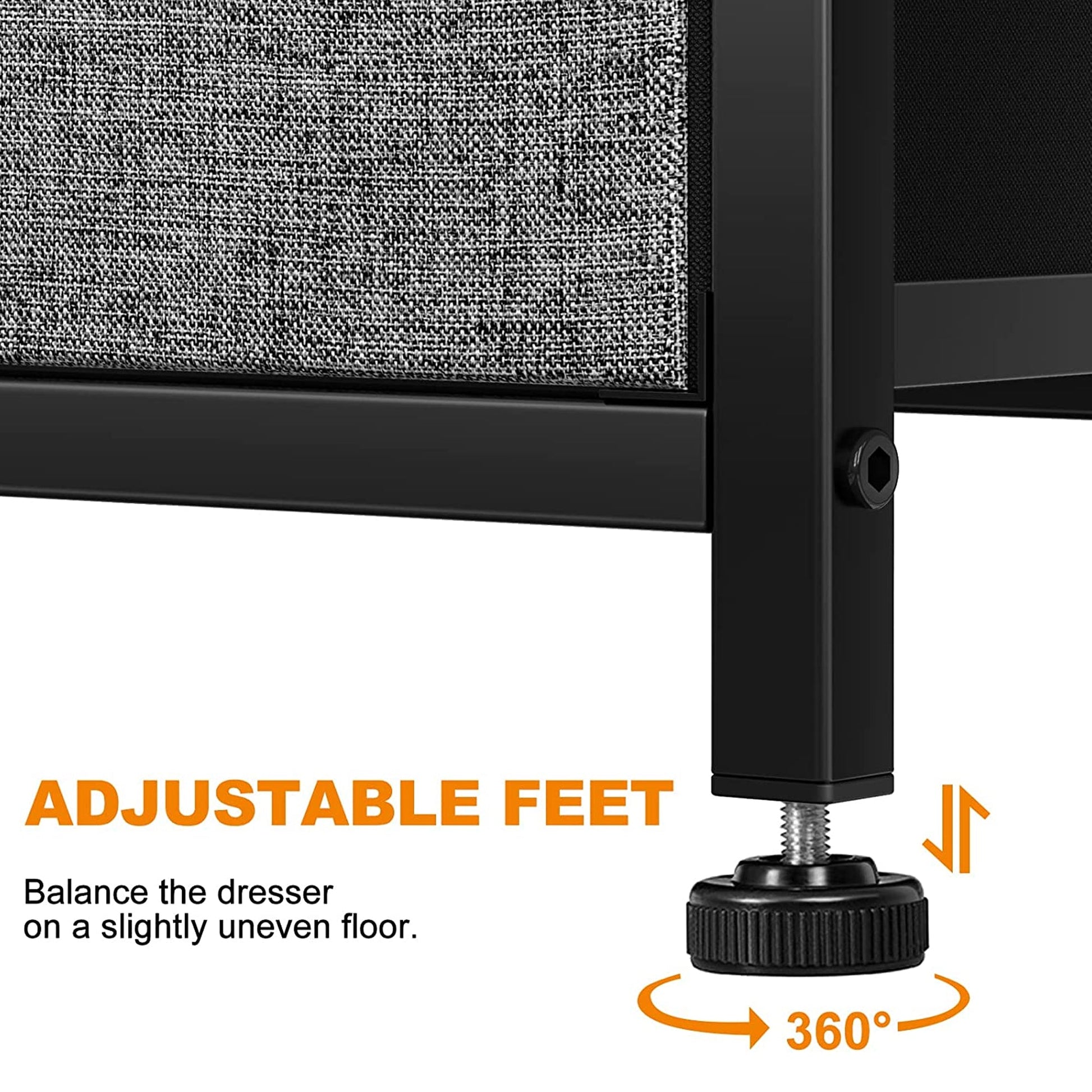 With 6 drawers, this minimalist-designed storage piece provides the room you need to store anything from extra blankets to household items and everything in between. The steel frame and MDF drawers and top provide a sturdy structure made from durable materials. Adorn the spacious top surface with your favorite decorative items. The adjustable feet and wall attachment add a level of increased safety, especially if you climbing pets or kiddos.
