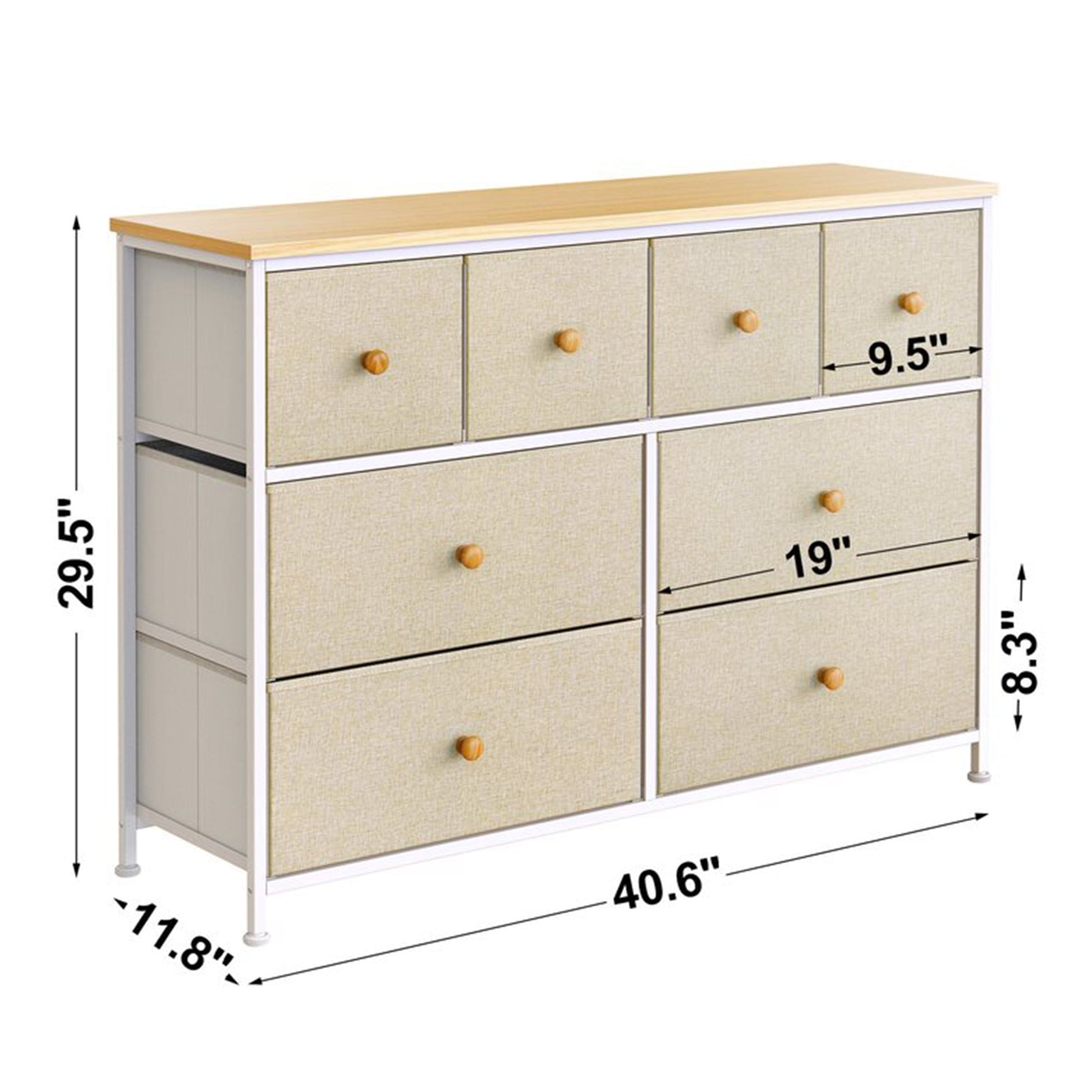 With 8 drawers, 4 small and 4 big, this minimalist-designed storage chest provides all the room you need to store anything from clothes to home goods. The steel frame, wooden countertop, and fabric drawers provide a sturdy structure made from reliable materials. Adorn the top 40.60-inch waterproof surface with your favorite decor items. The adjustable feet and wall attachment add a level of increased safety, especially if you have climbing pets or kiddos.