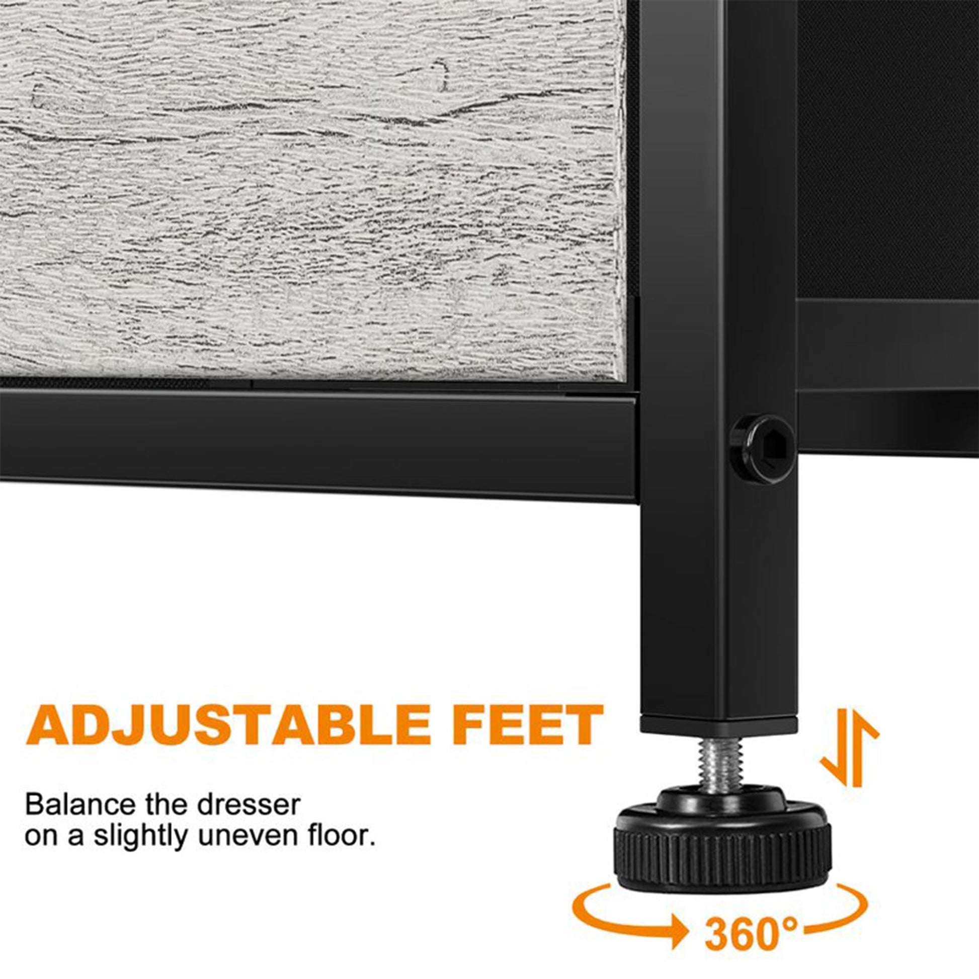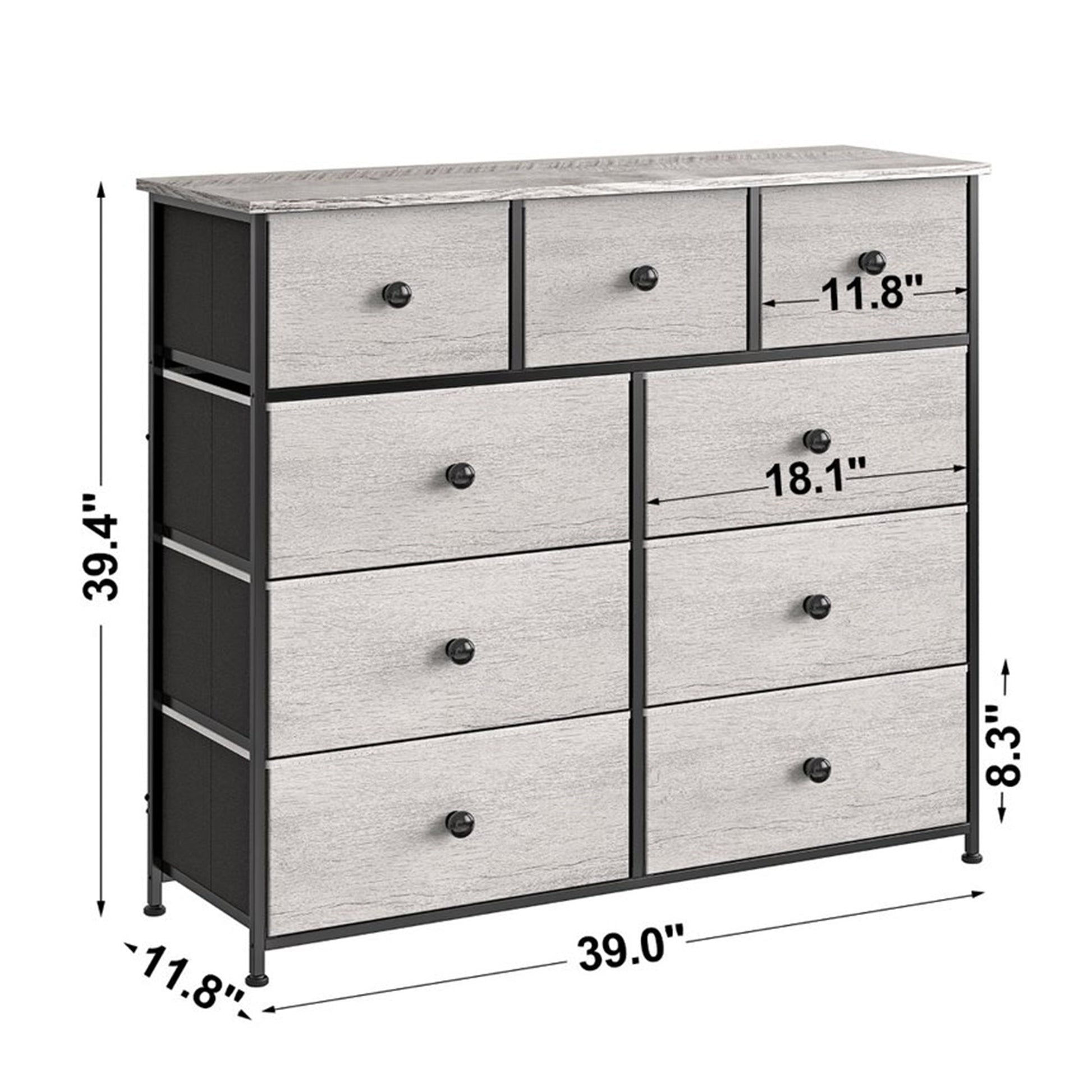 With 9 drawers, 3 small and 6 big, this minimalist-designed storage chest provides all the room you need to store anything from clothes to home goods. The steel frame, wooden countertop, and fabric drawers provide a sturdy structure made from reliable materials. Adorn the top 39-inch waterproof surface with your favorite decor items. The adjustable feet and wall attachment add a level of increased safety, especially if you have climbing pets or kiddos.