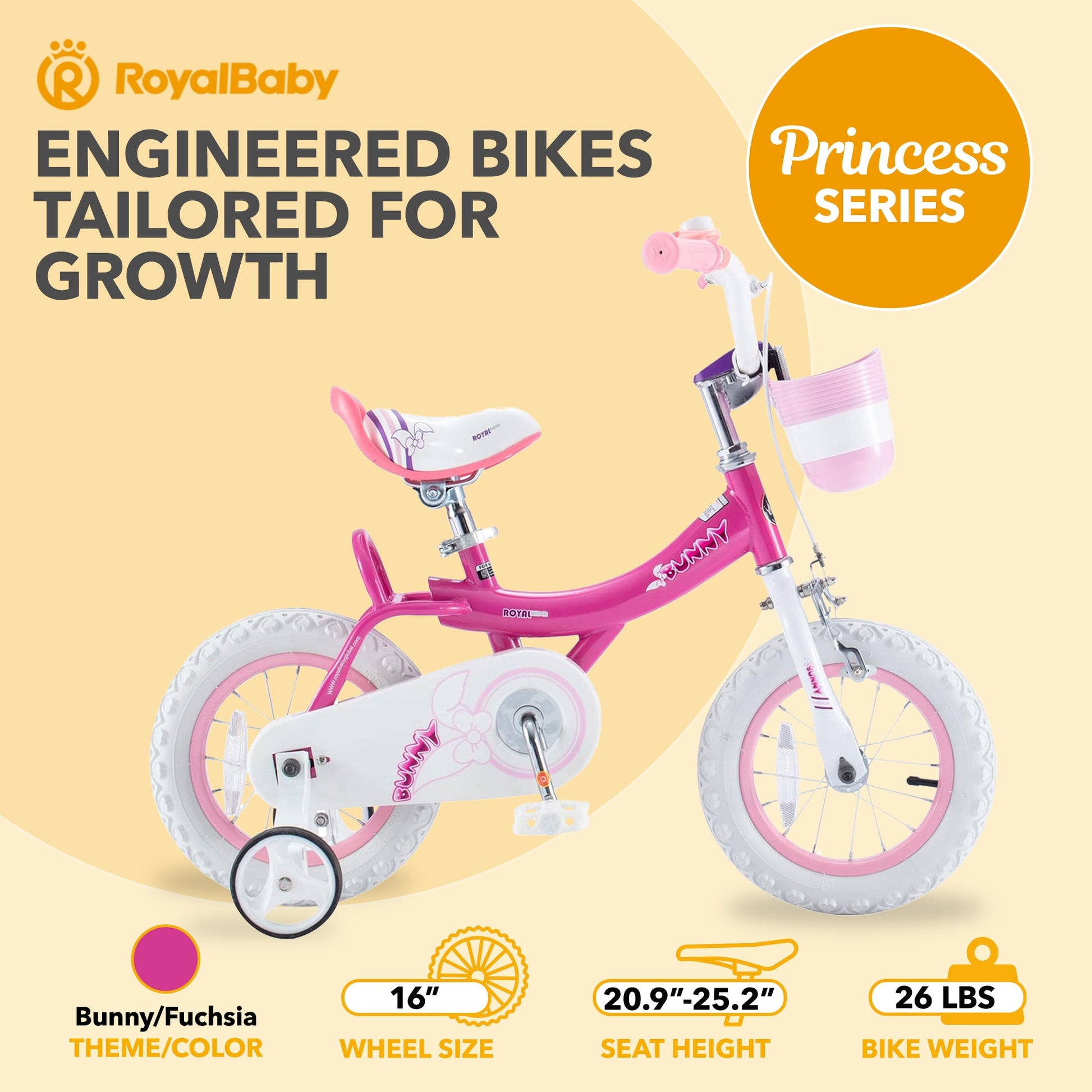 RoyalBaby Princess Girl Bike 16" w/Training Wheels & Kickstand, Bunny/Fuchsia