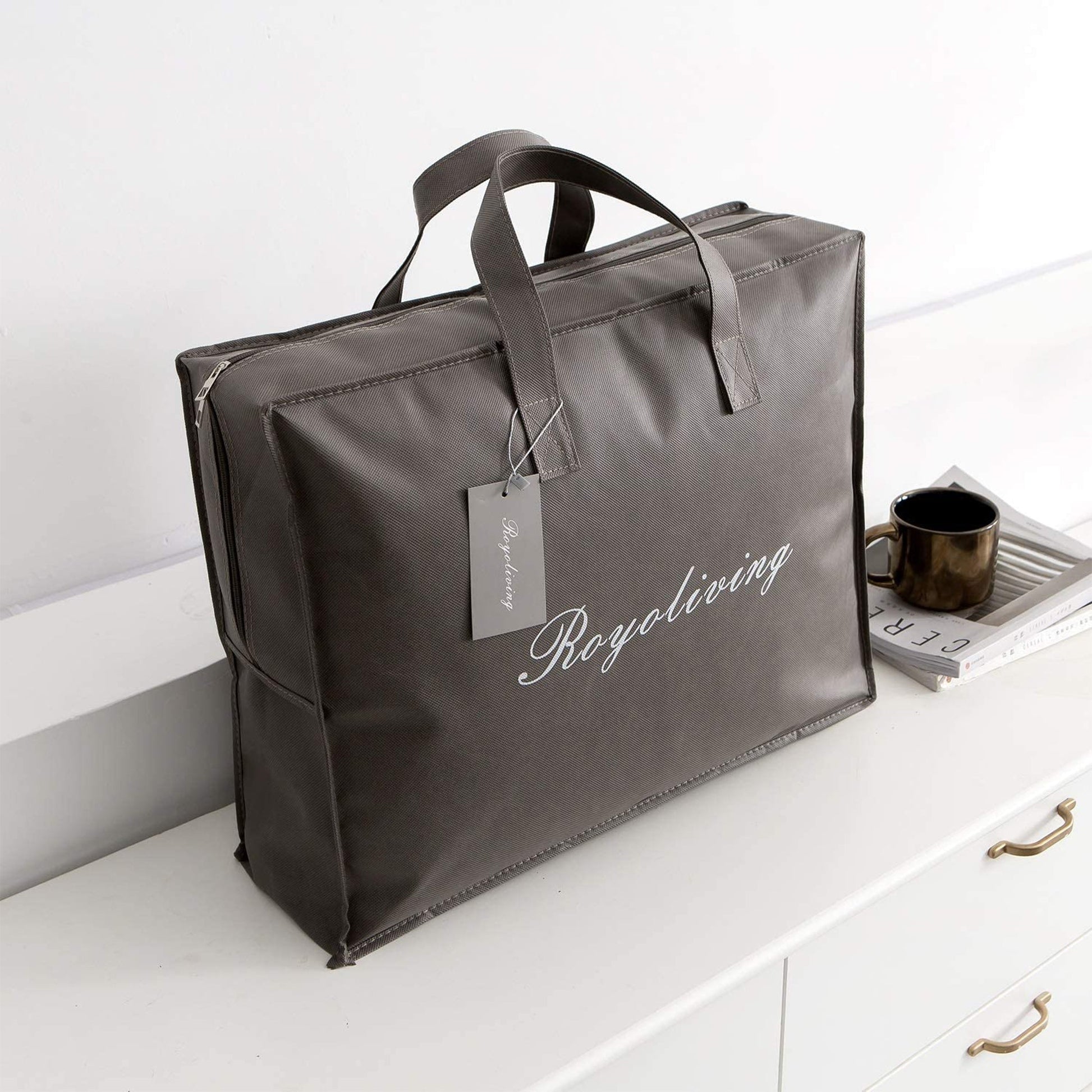 This white bedding blanket is not a duvet insert but a complete comforter with a cotton cover and generously stuffed with goose down. The king-size comforter cover is woven from premium Egyptian cotton that stays soft and breathable, even after repeated washings, and stays in place without shifting thanks to the durable box-stitch design. The padding is so thick, it even dampens noise by up to 10 decibels! Both the cotton and down are carefully sourced and processed with consideration for animal kindness, environmental consciousness, and consumer health and safety. Packaged in a chic zippered handle bag, the down comforter fluffs up to its full size in a couple of hours. For added convenience, the white comforter is machine-washable.