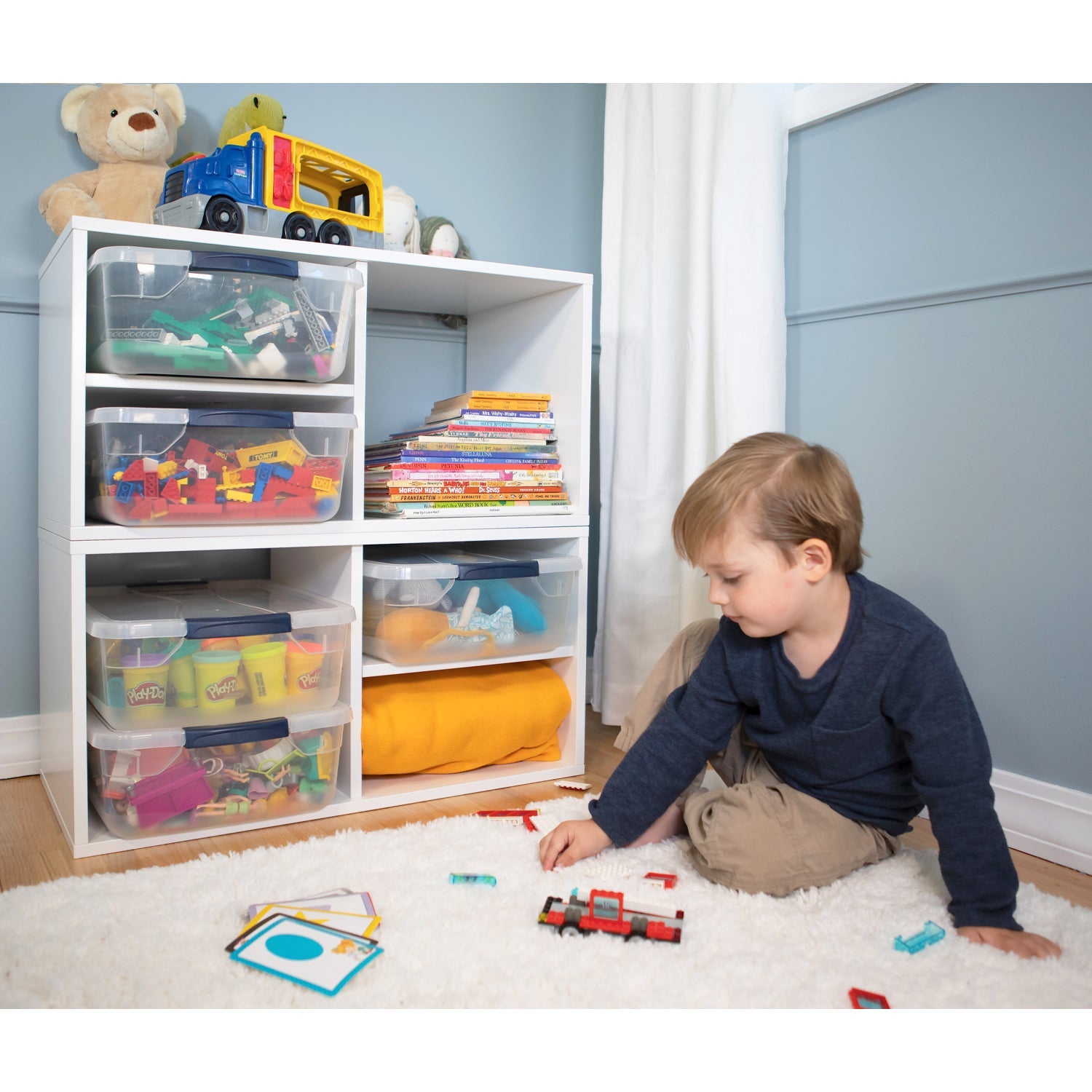 With a 95-quart capacity, this storage container is great for storing items like art supplies, kitchen spices, hats and gloves, seasonal clothing, toys, office supplies, holiday decorations, and more. This storage box's shape is ideal for use as a shoebox too. You can easily see what you stored inside the bin thanks to its clear sides and lid.