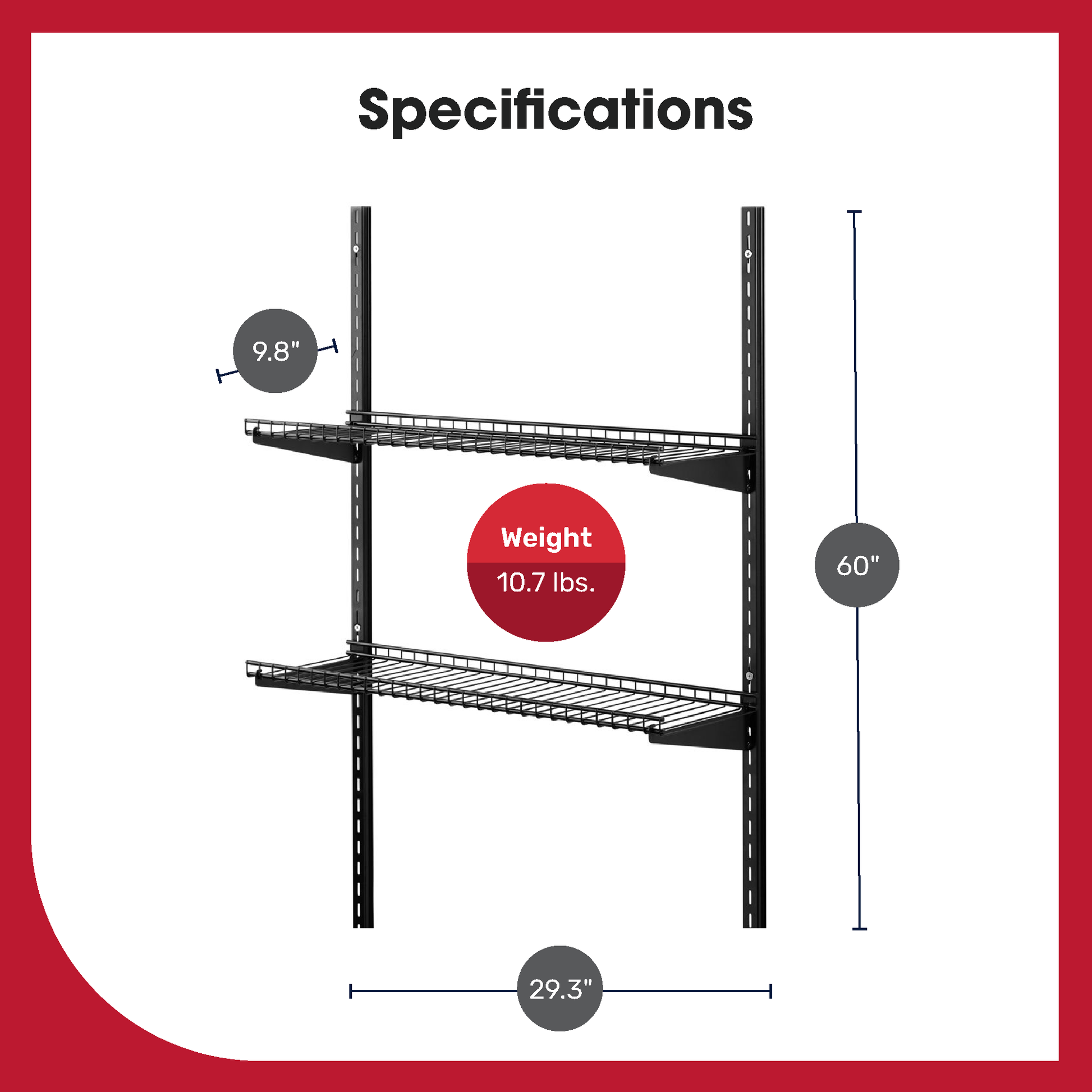 - Storage shelf kit includes 2 wire shelves, 2 uprights, 4 shelf brackets, and other required installation hardware