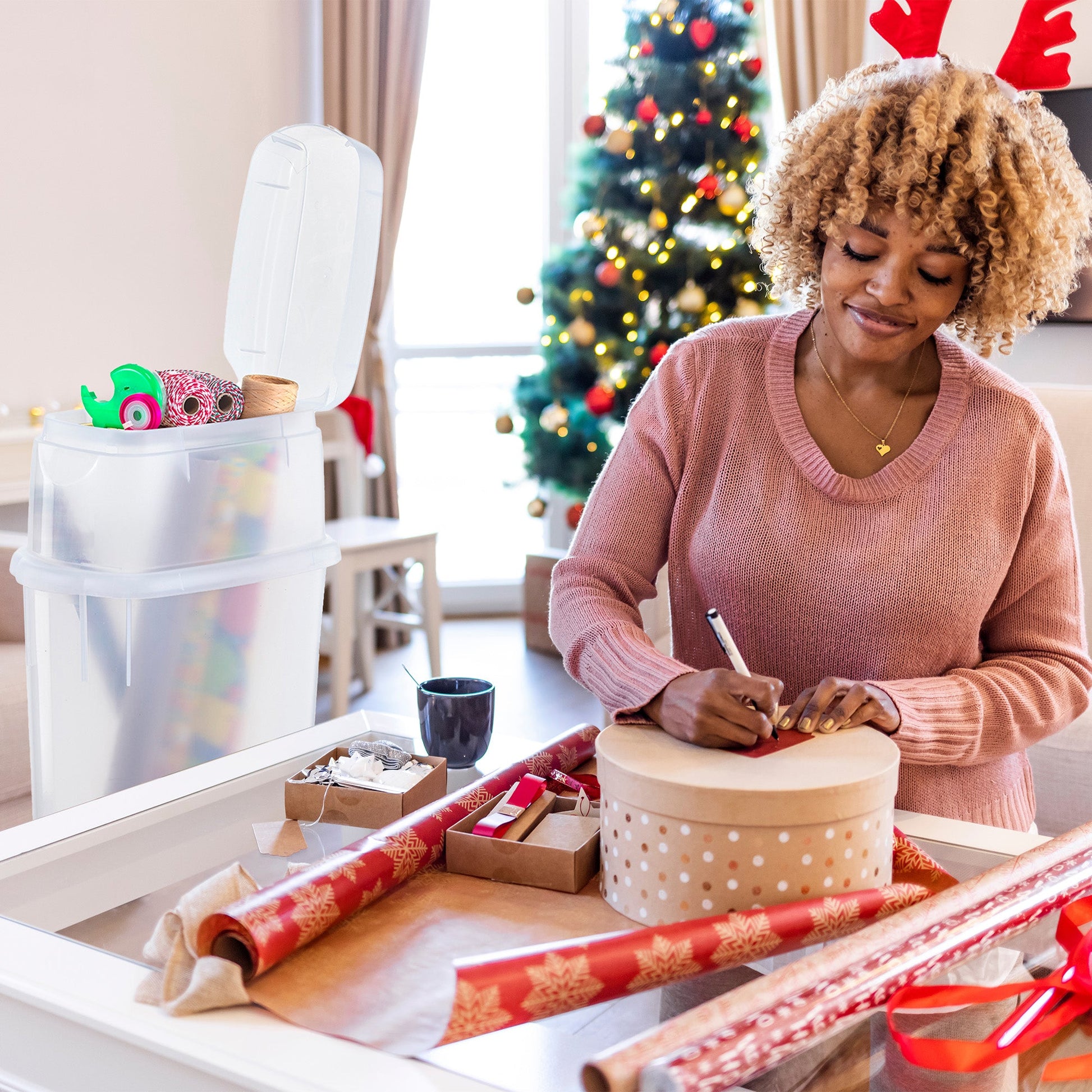 With 2 compartments for storing gift wrapping items, the large bottom compartment holds up to 20 rolls of standard 30-inch wrapping paper along with gift bags, tissue paper, and other larger supplies. The small top compartment conveniently stores tape, scissors, tags, and bows, conveniently holding all your supplies together so you don't need to search. Semi-transparent exterior walls eliminate guess work by letting you see into the container without removing the lid. Constructed from highly-durable plastic that withstands impacts, your gift wrapping remains safe throughout the off-season so you're ready for the holidays.