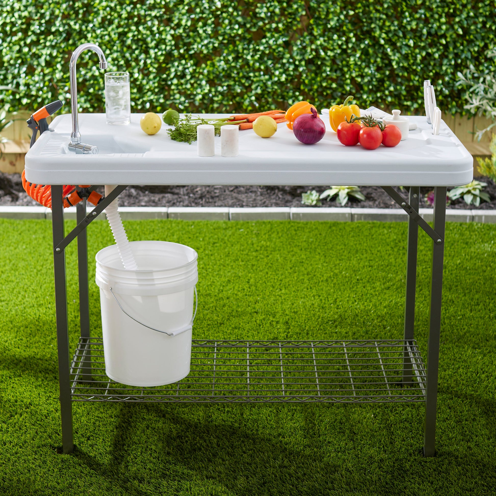 The camp table offers multi-purpose use, great as a plant potting bench, dishwashing station, tailgate table, or even as a handy portable sink to load up with your beach gear for a day at the beach! Constructed of durable blow-molded poly, this portable table is built to withstand the elements, so no matter the hunting season, you can wash and prepare your game with confidence. Featuring a quick-connect sink faucet and sprayer nozzle that can be hooked to a garden hose, the collapsible camping table provides a tapered channel for water drainage, while the included drain hose can be attached to a bucket for easy and convenient disposal (hose and bucket not included). Store your deer processing equipment or fish cleaning kit accessories on the convenient bottom shelf of this outdoor sink station provides, so you can keep all your prepping essentials handy. The outdoor prep table has a 150-pound capacity and includes a convenient built-in ruler located on the tabletop, perfect for fishermen, hunters, and outdoor cooking enthusiasts who want to measure the size of their meats before cooking. For quick and easy storage and transportation, simply fold the legs and disconnect the faucet from the lightweight camping table.