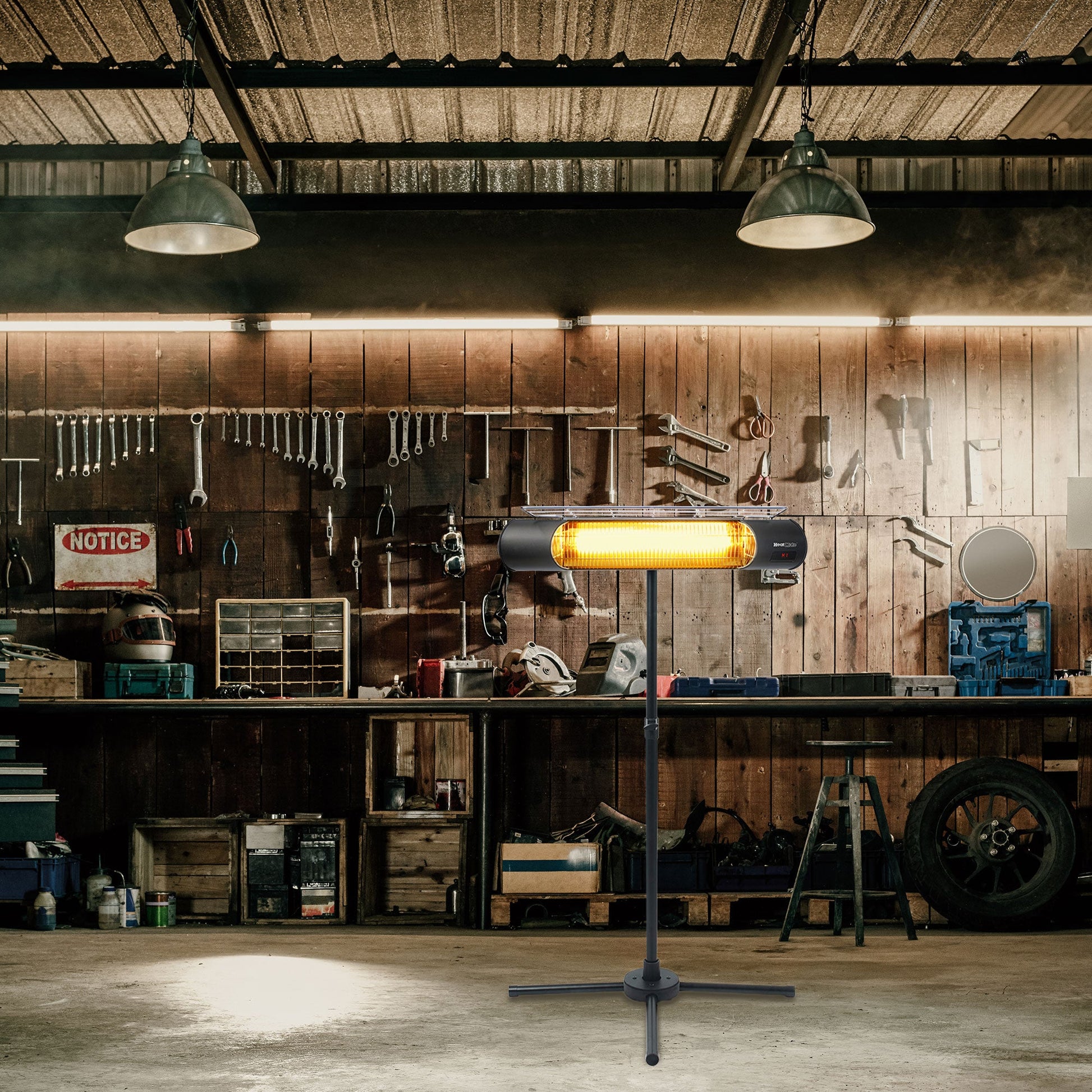 Mount this heater vertically or horizontally on almost any outdoor wall using the included metal fittings, or place it on the included tripod stand for ultimate portability convenience. The 1000-watt heater reaches maximum output in only 0.2 seconds while measuring 30 inches long, 5.3 inches wide, and 5.5 inches tall.