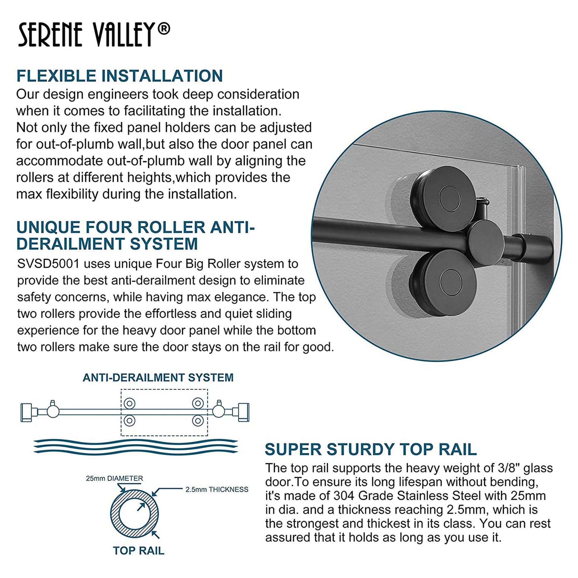 - Big rollers can be mounted on the door panel and adjusted up and down, allowing for a slight horizontal tilt to fit out-of-plumb walls