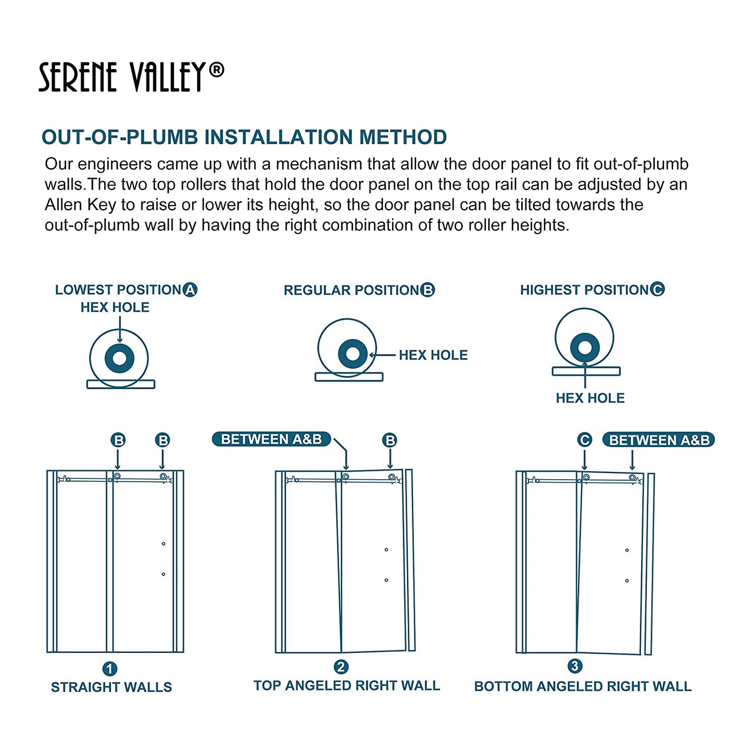 The shower door features an adjustable width from 56 to 60 inches wide and measures 66 inches high. Shower with confidence and ease with the 66 Inch Big Roller Sliding Shower Door from Serene Valley.