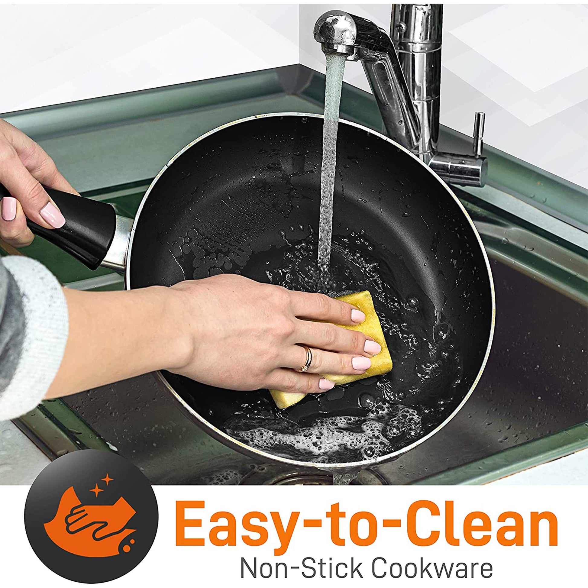 Made of pressed aluminum metal, they are suitable for gas, electric, and ceramic counter cooktops. The set comes with a 0.89-quart saucepot, 1.90-quart saucepot, 4.70-quart dutch oven, 2.5-quart saute pan, 8-inch pan, and a 10-inch pan. The non-stick kitchenware has tempered glass lids with vents for steam to escape. This set is safe for the dishwasher and is easy to clean. Included cooking utensils are a solid spoon, slotted spatula, pasta server, soup ladle, and egg whisk.
