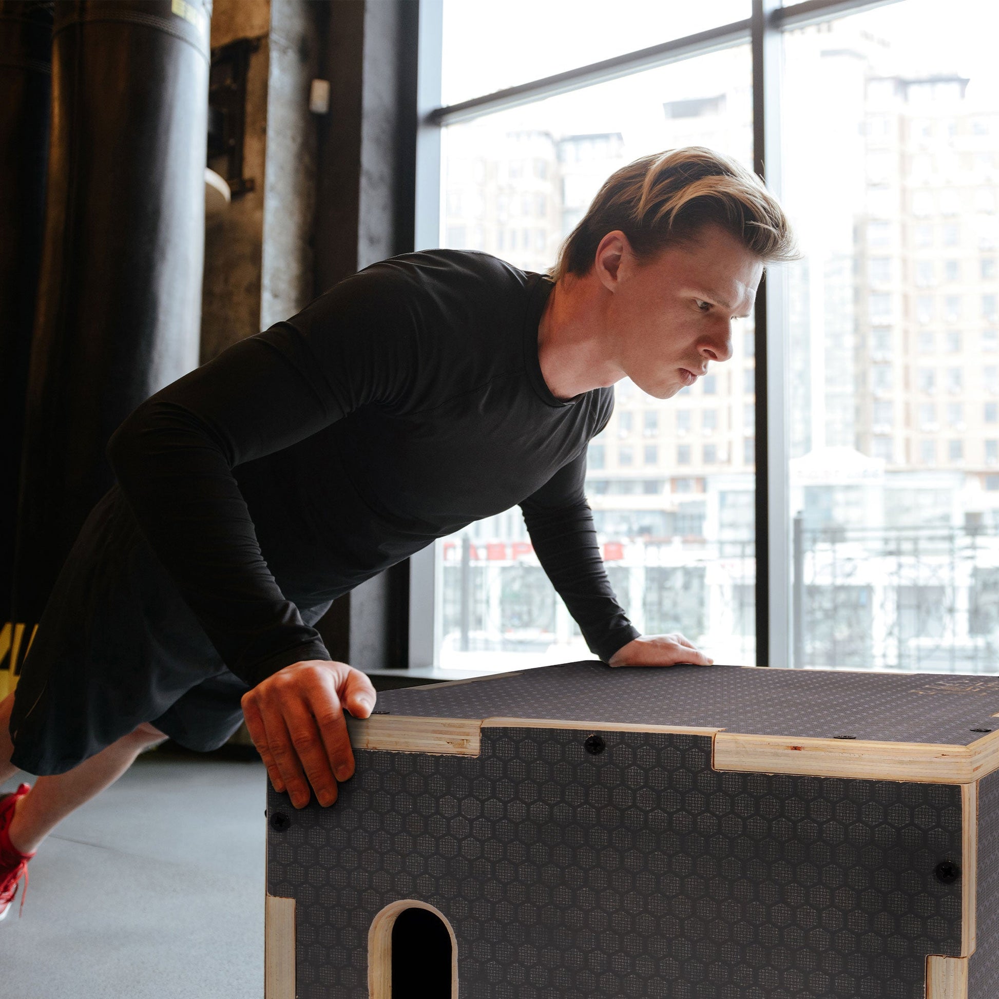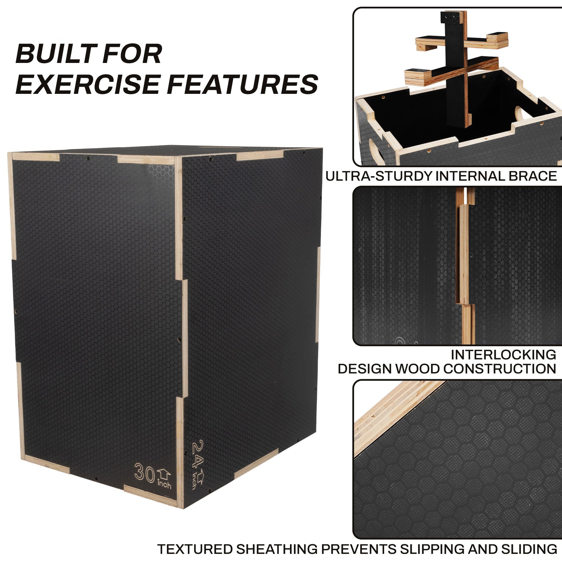 Designed for fitness enthusiasts of all levels, this versatile plyometric box offers a range of exercises to boost your agility, strength, and endurance. Crafted from high-quality wood, this workout accessory ensures durability and stability, making it a reliable companion for your workout routines. The non-slip surface provides a secure platform, allowing you to perform jumps, step-ups, and other exercises confidently. With 3 different height options (30-inch, 24-inch, and 20-inch) in one box, you can customize your workouts to match your fitness level and goals whether training for sports, improving your cardiovascular health, or enhancing your overall fitness, this plyo box is designed to meet your needs.