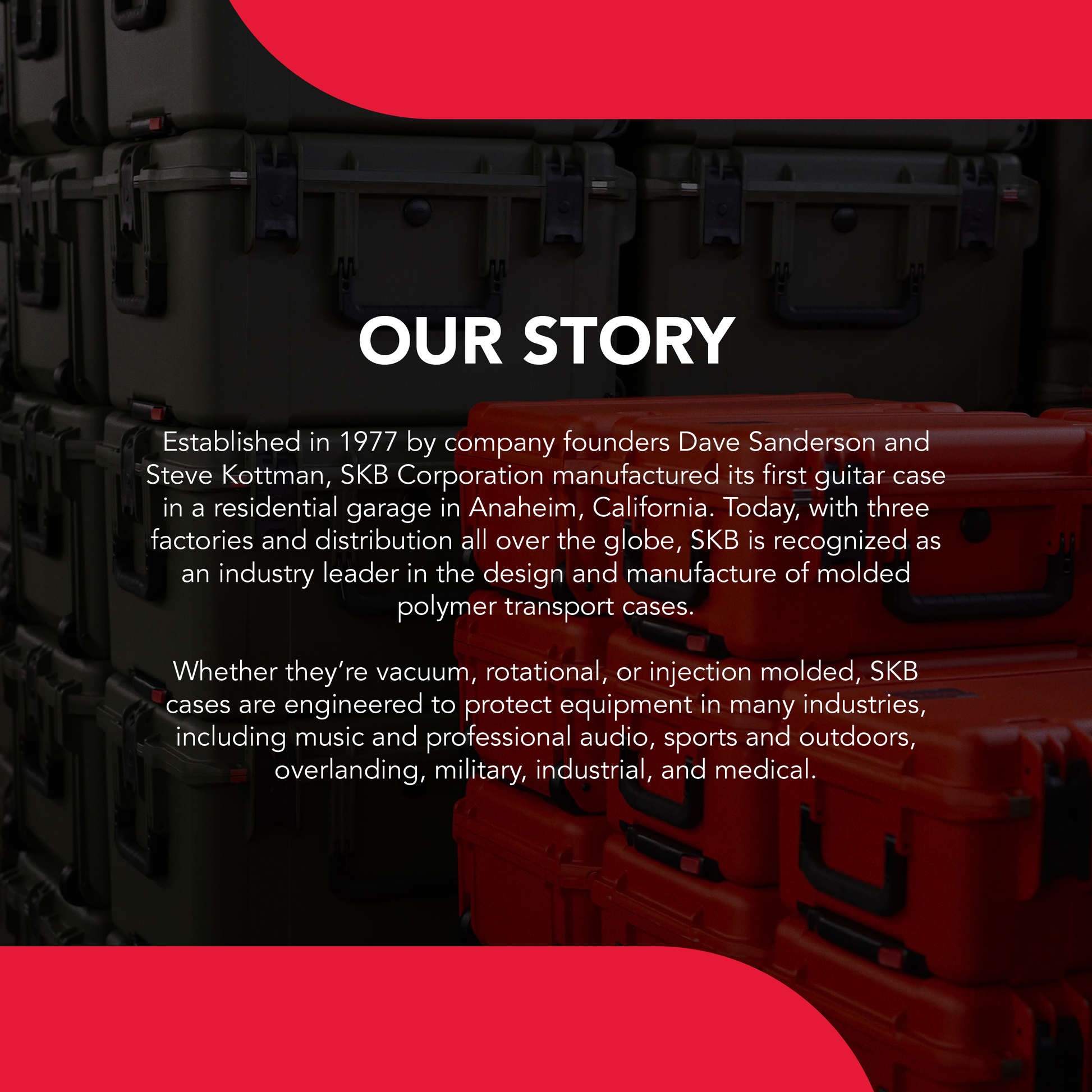 Established in 1977 by Dave Sanderson and Steve Kottman, SKB is an industry leader in the design and manufacture of molded polymer transport cases. Whether they’re vacuum, rotational, or injection molded, SKB cases are engineered to protect equipment in many industries, including music and professional audio, sports and outdoors, overlanding, military, industrial, and medical.