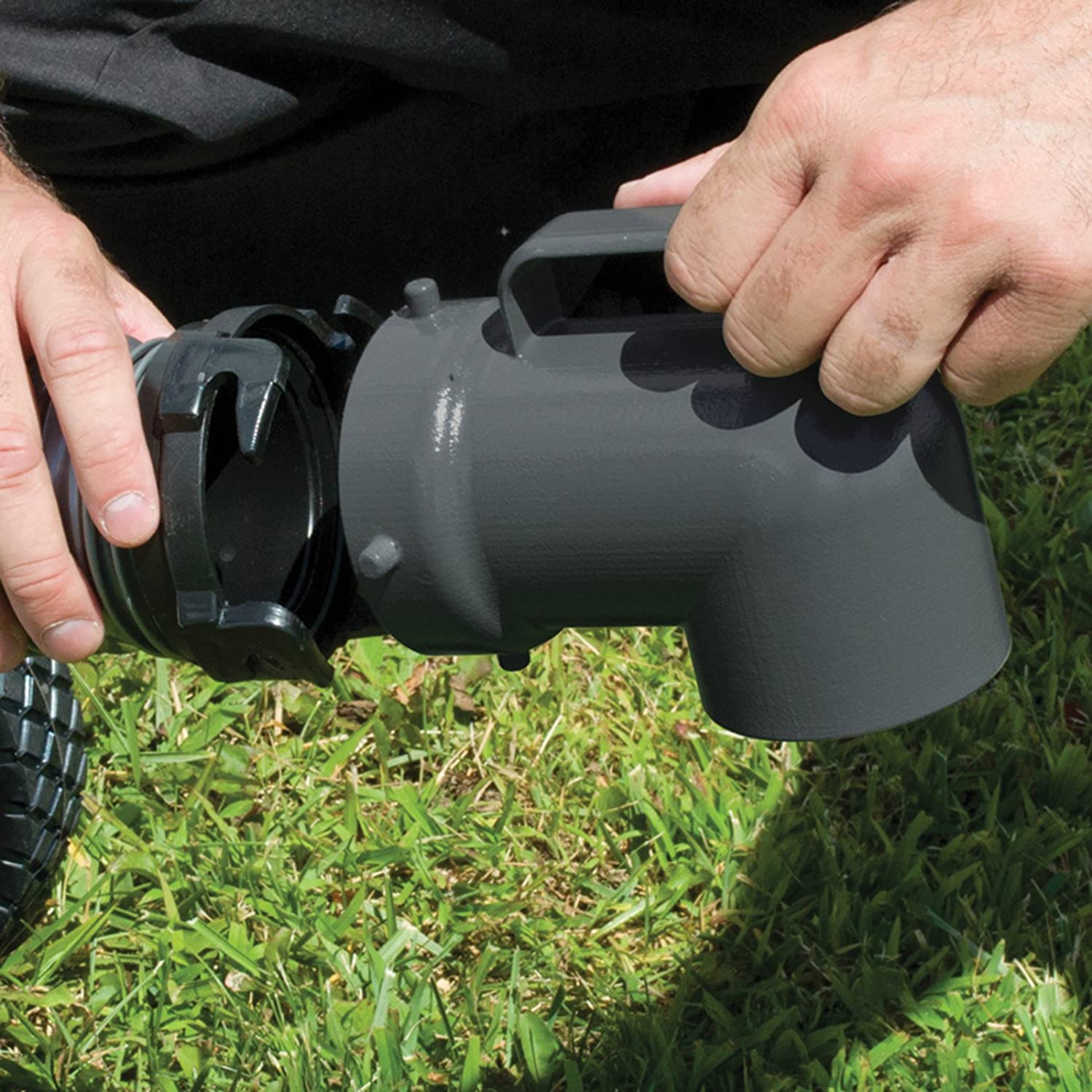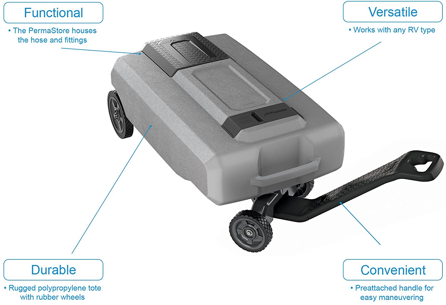 This functional waste tank tote features a large 27-gallon capacity, which is great for long trips or trips with families and friends. There's no heavy lifting, transport the RV waste tank easily with 4 rugged rubber wheels and an extendable handle that hooks onto trailer hitches for easy maneuvering.