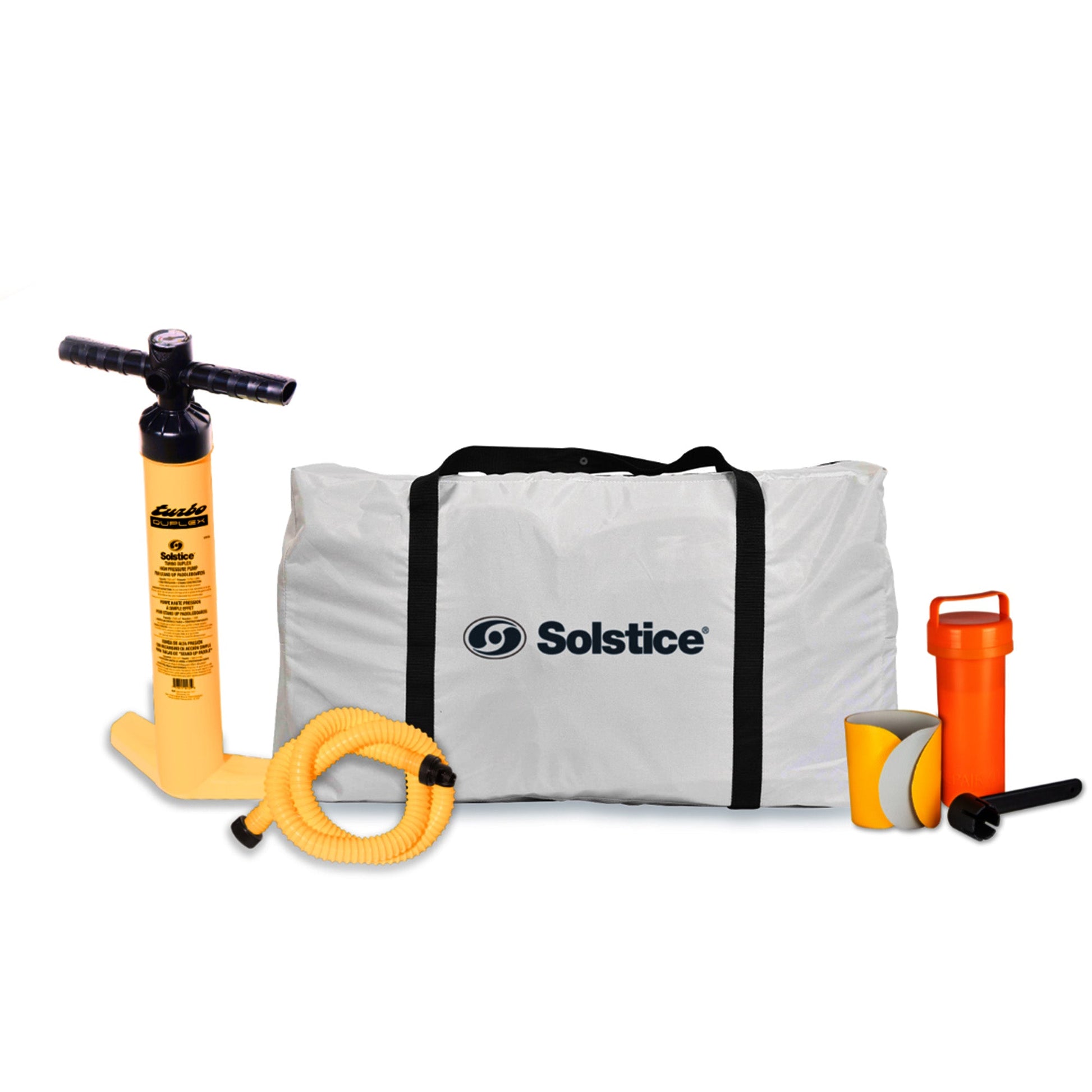 Solstice Inflatable Docks were invented with one goal in mind: to create a floating “home-base” on the water. Throw on some lounge chairs and a cooler, and you’ve created your own floating island to kick back with friends and family. Designed with military-grade PVC & our state-of-the-art dropstitch technology, our inflatable docks feel rigid when inflated, and are incredibly light & compact when folded up in its included carry bag. Solstice Inflatable docks are designed with reinforced grab handles, stainless steel D-ring tie-downs, and a high-pressure HR SOL-VALVE for quick inflation and deflation. Solstice recommended inflated pressure is between 7 and 10 PSI – use the included hand pump to reach your desired pressure.