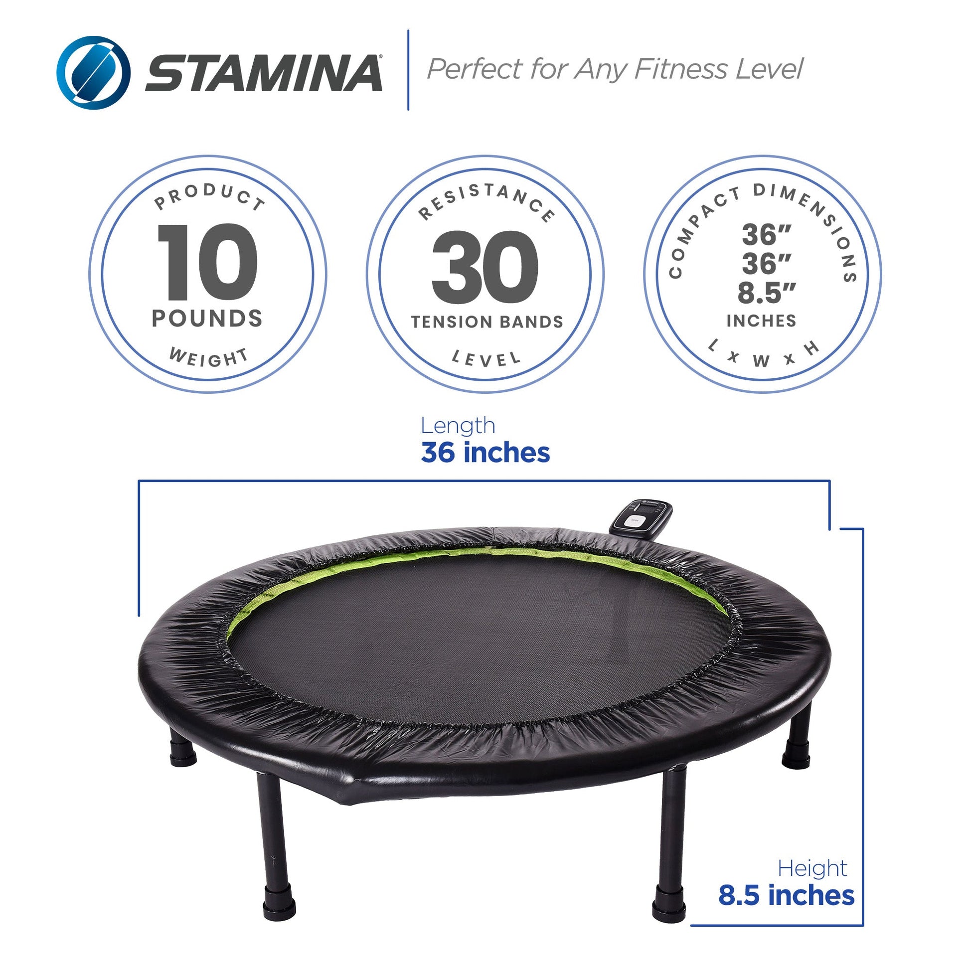 - Round, 36-inch trampoline offers home rebounding full-body workouts for cardio, toning, and strength