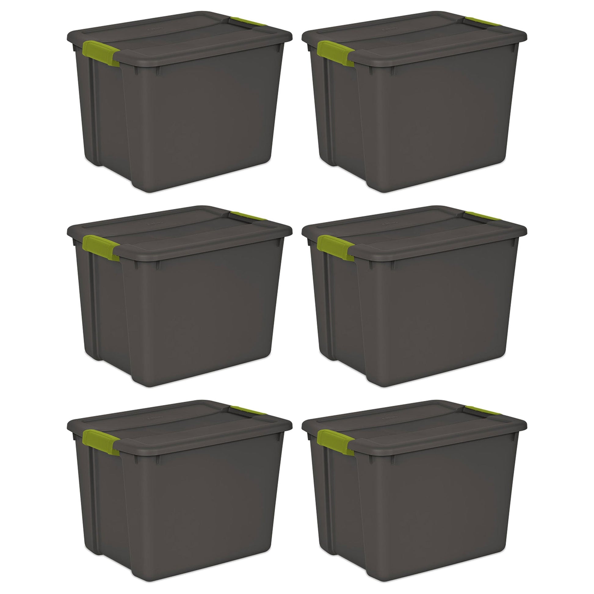 Discover a reliable storage solution with the 6-pack of Sterilite 12-Gallon Versatile Rectangular Latch Totes in stylish gray with vibrant green handles.