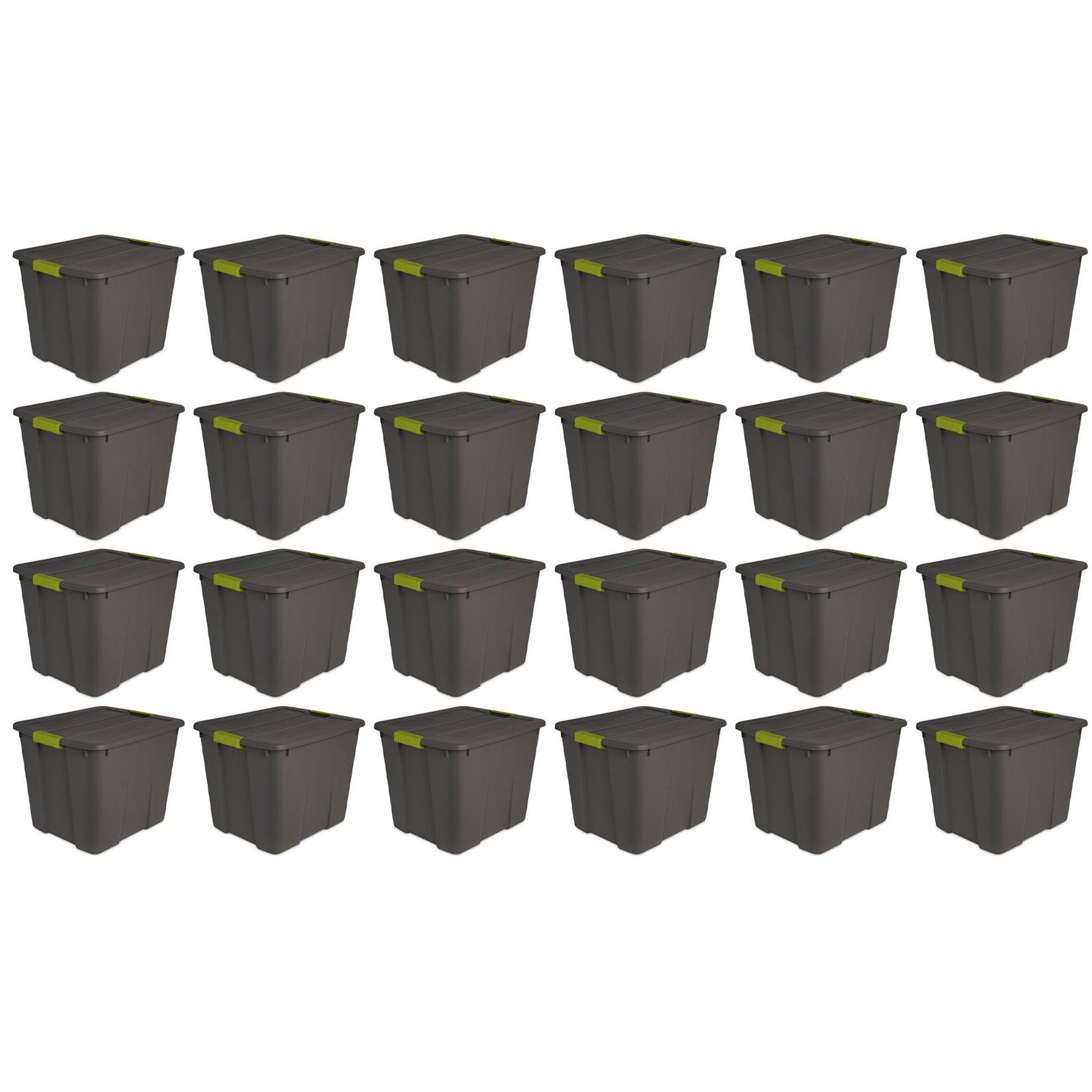 Discover a reliable storage solution with the 24-pack of Sterilite 20-Gallon Stackable Totes in stylish gray with vibrant green handles.