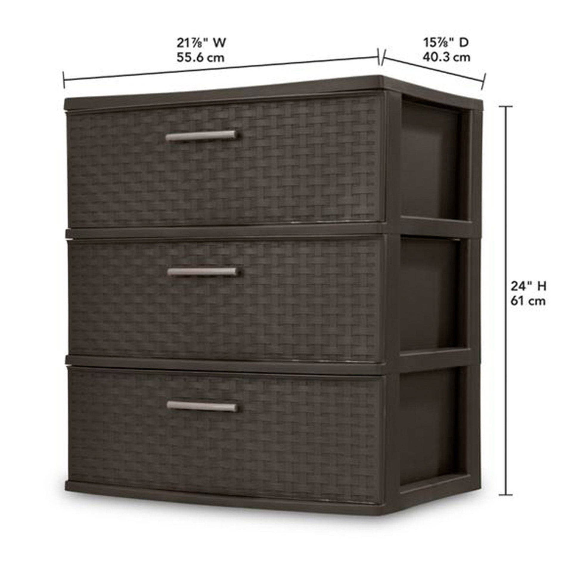 Designed with a stylish weave pattern, these storage towers not only provide a furniture-like appearance but also ensure durability with their easy-to-clean plastic material. The 3-drawer storage chests is ideal for storing clothing or doing a bit of good old-fashioned organizing. It features 3 spacious drawers with convenient pull handles as well as a durable, long-lasting plastic construction. Not your average storage solution, this fresh take on organization is designed to look like a dresser with its intricate weave design.
