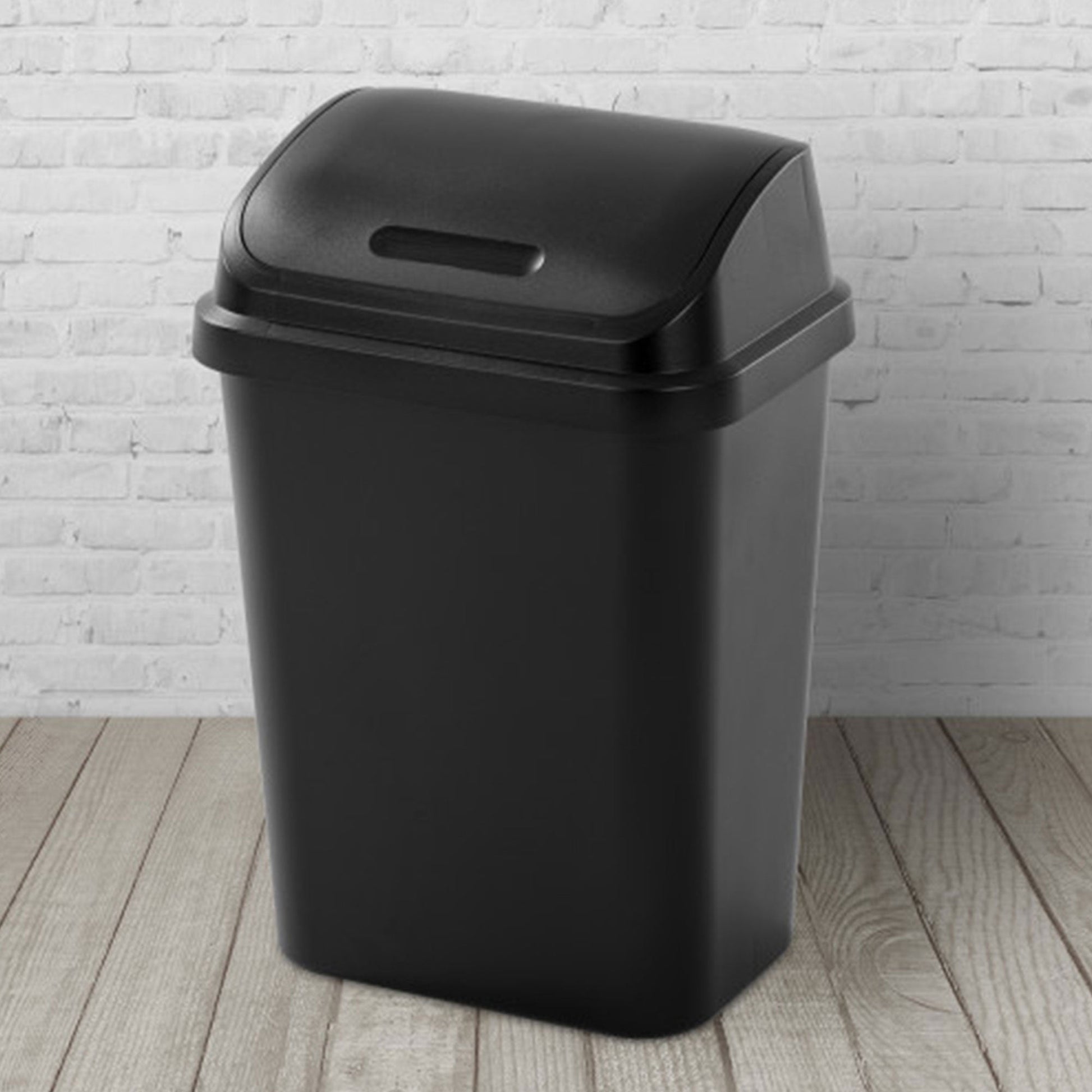Securely staying upright for your convenience, the lid opens effortlessly with just a touch. Its swing-in feature facilitates easy disposal, complemented by a discreet bag-hiding rim for a tidy look. Built for durability, the wastebasket is designed to withstand the demands of day-to-day use in busy rooms. The contemporary design, square profile, and sleek lines effortlessly enhance any home decor, while the classic color adds a touch of sophistication. Its mid-sized capacity is perfect for high-traffic areas, accommodating a standard 8-gallon trash liner. Crafted from easy-to-clean plastic with a textured surface, maintenance is a breeze. Versatile and stylish, it's the ideal solution for spaces like the kitchen, bathroom, bedroom, dorm room, mudroom, or basement.