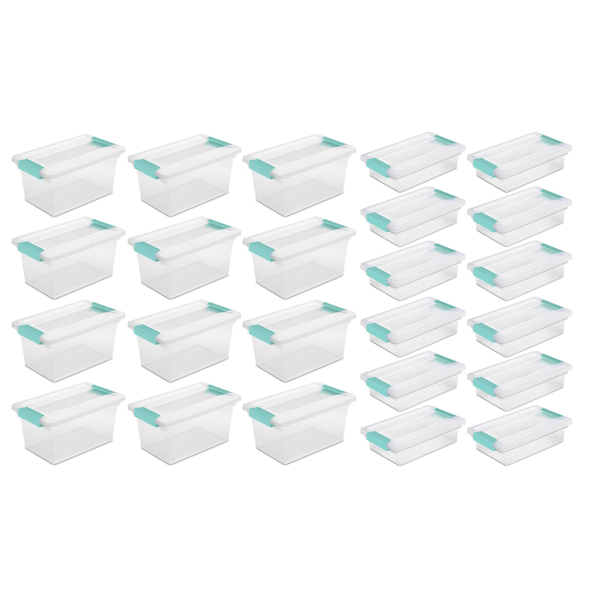 This 24 count features 12 medium clip storage totes and 12 small clip storage totes, providing you with the exact space you need for varying household items. With strong latches that attach the lid securely to the base, you'll be able to ensure the contents remain safe while stored. The see-through base allows contents to be easily identified and the totes are designed to stack on top of each other, making excellent use of verticle storage space, without the hassle of wondering what items are in which tote.